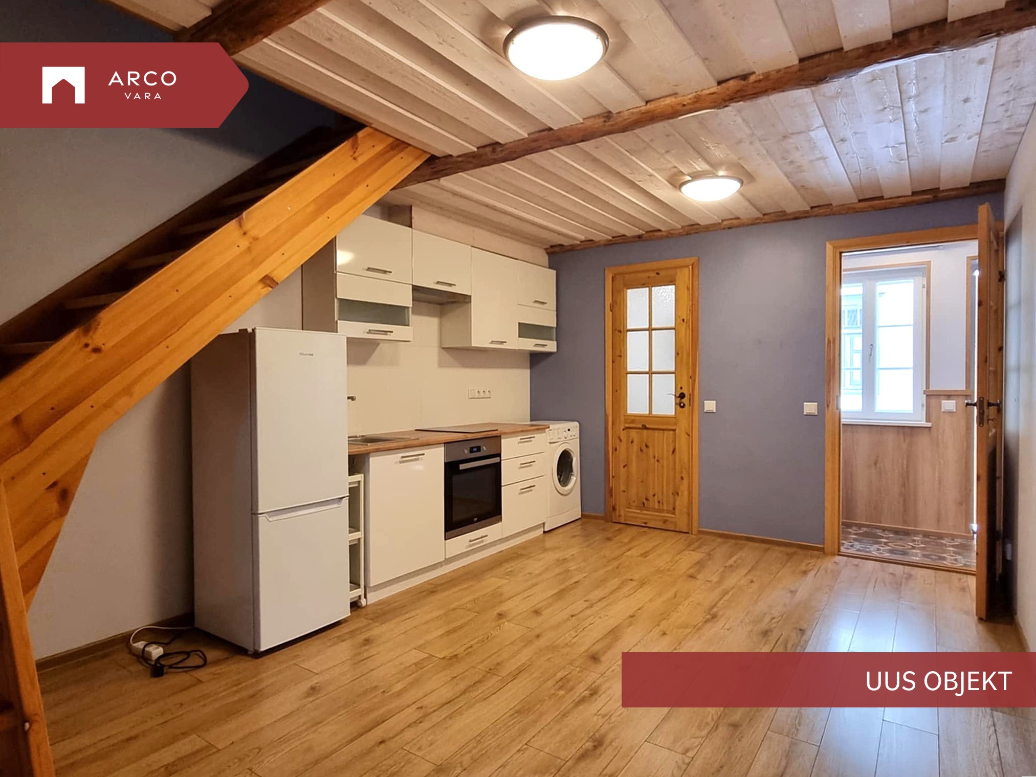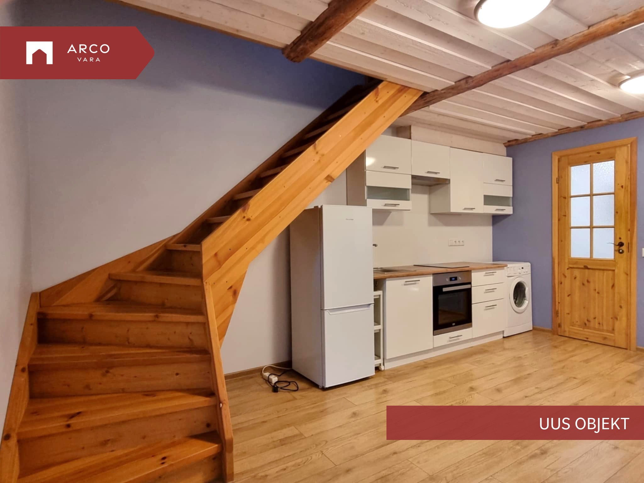 Läbi kahe korruse asuval korteri suuruseks on 35m2. Esimesel korrusel avatud elutuba-köök (köögimööbel, elektripliit, külmkapp, pesumasin). Wc ja duširuum koos. Esik.