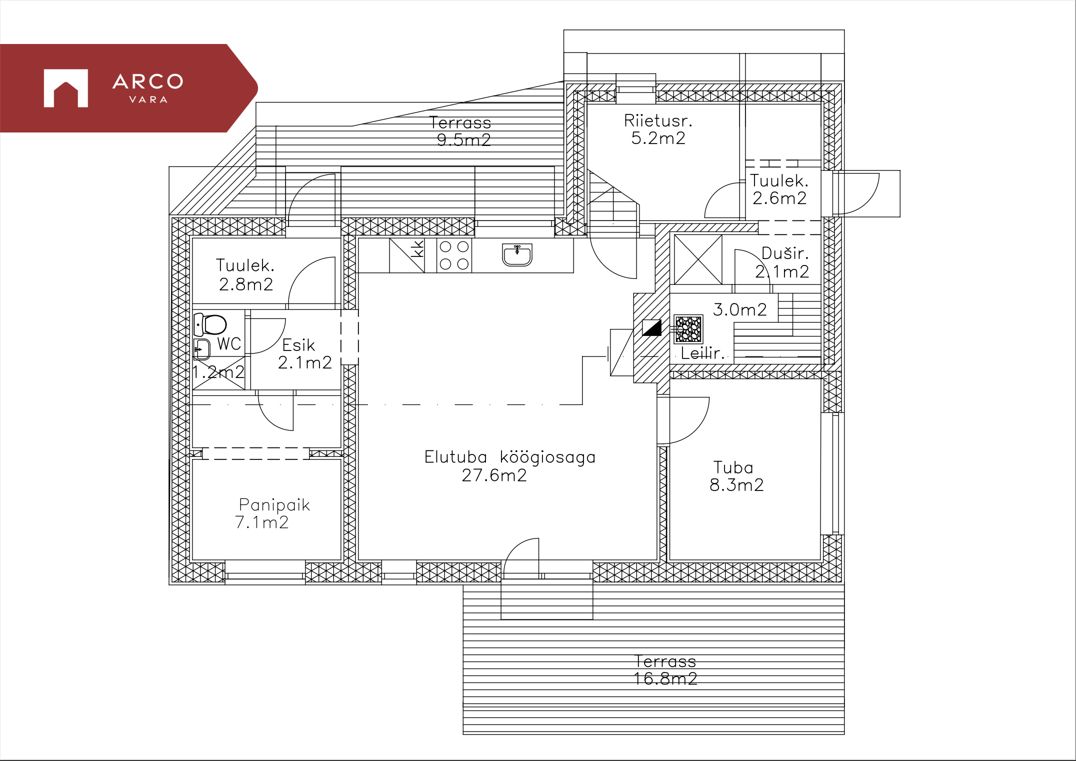 - elutuba koos avatud köögiga: 27,6m2 - pääs maja taha lõunapoolsele terrassile (16,8m2)