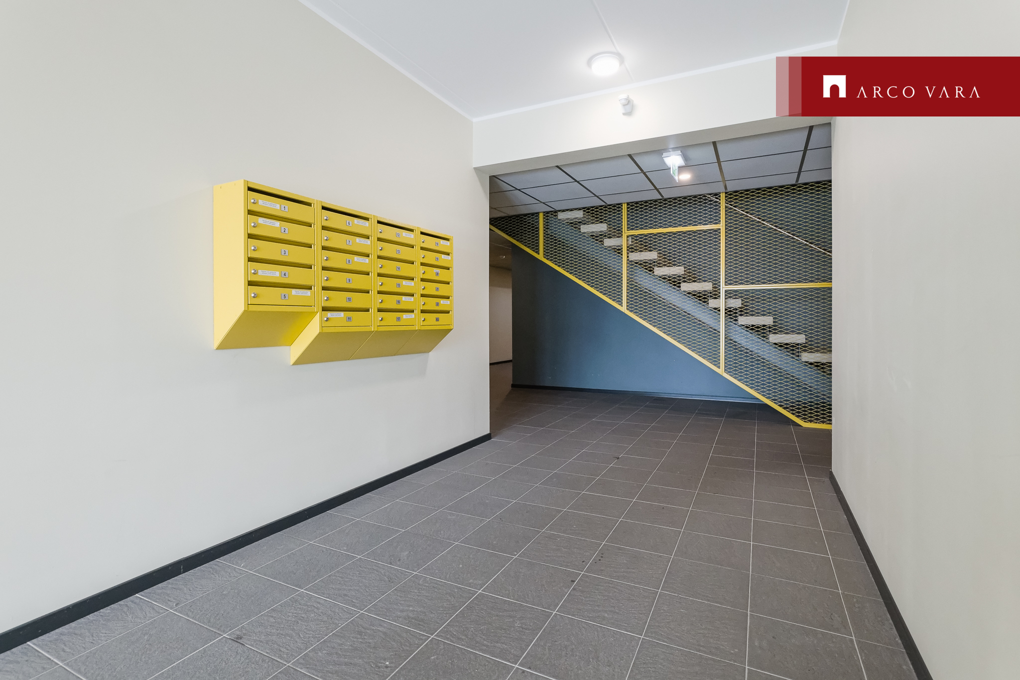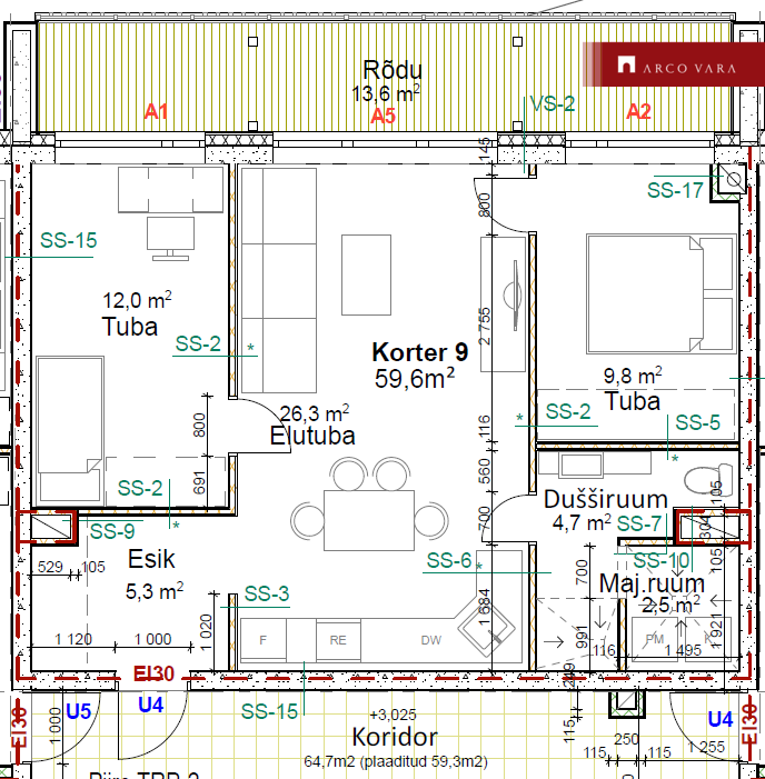 - living room with open kitchen (26.3 m2), from which access to the balcony (13.6 m2), windows facing the front of the house;