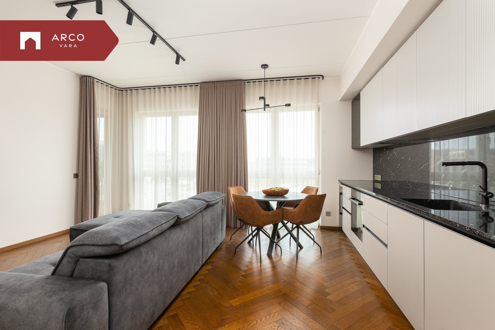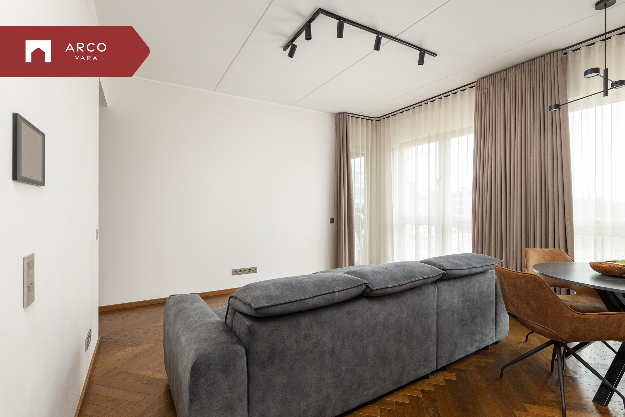 Korteri kõrged aknad toovad tuppa rohkelt loomulikku valgust ja loovad avara, õhulise tunde kogu elamispinnas.