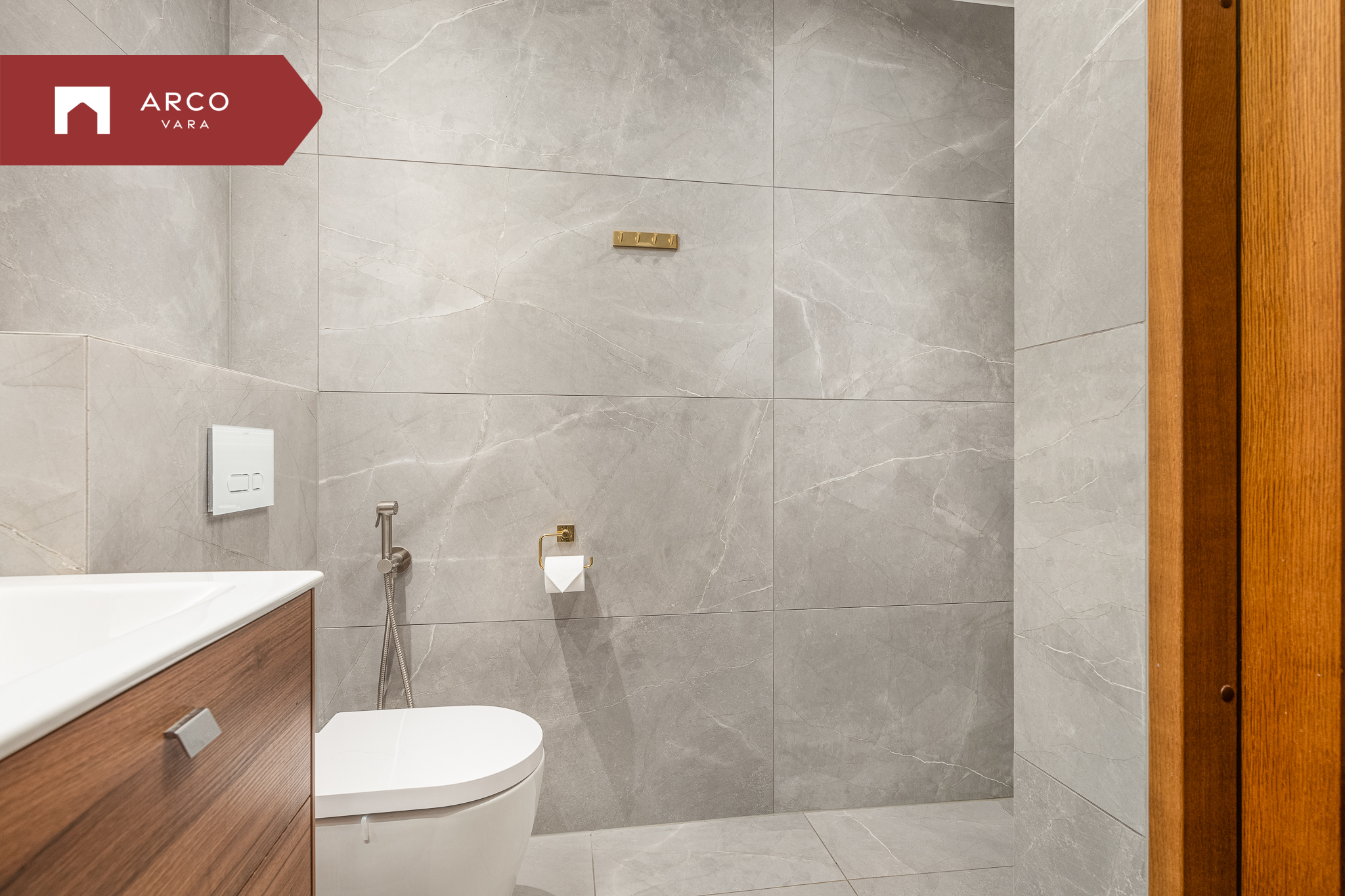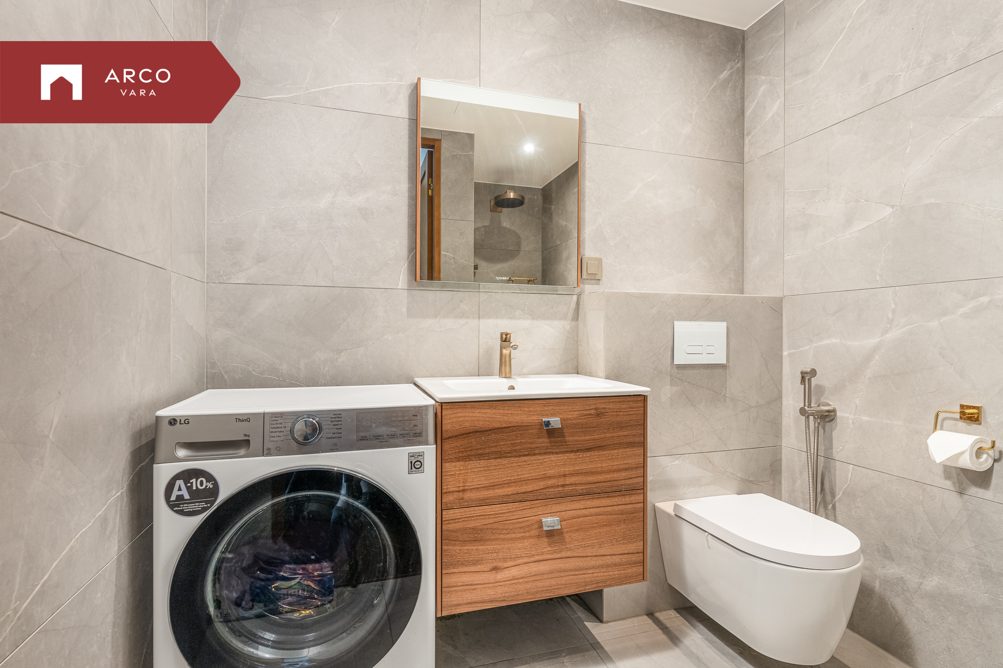 Vannituba on kaasaegse viimistlusega: seintel ja põrandal suured keraamilised plaadid, kvaliteetne santehnika ning lisamugavust pakkuvad Duravit valamualune kapp ja peegel. Santehnika kuulub Hansgrohe harjatud messingist seeriasse, mis rõhutab üldist luksuslikku joont.
