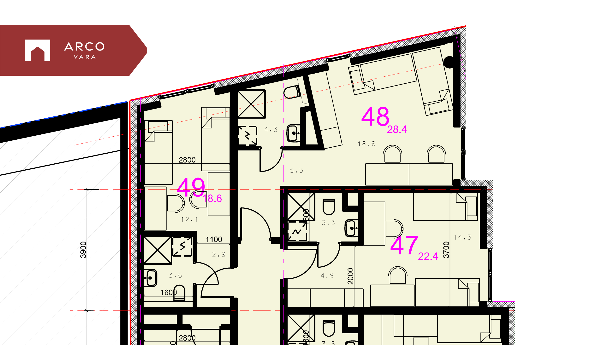 49 tuba (suurusvahemik 18,4m²...28,4m²), igaühes dušinurga ja WC-potiga vannituba ning köök
