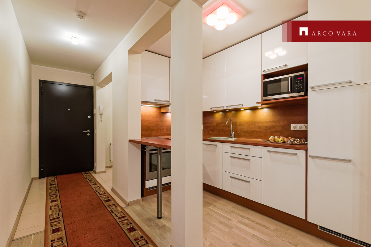 Köögimööbel on varustatud integreeritud tehnikaga: külmik, keraamiline pliidiplaat, ahi, õhupuhasti, nõudepesumasin ja mikrolaineahi.