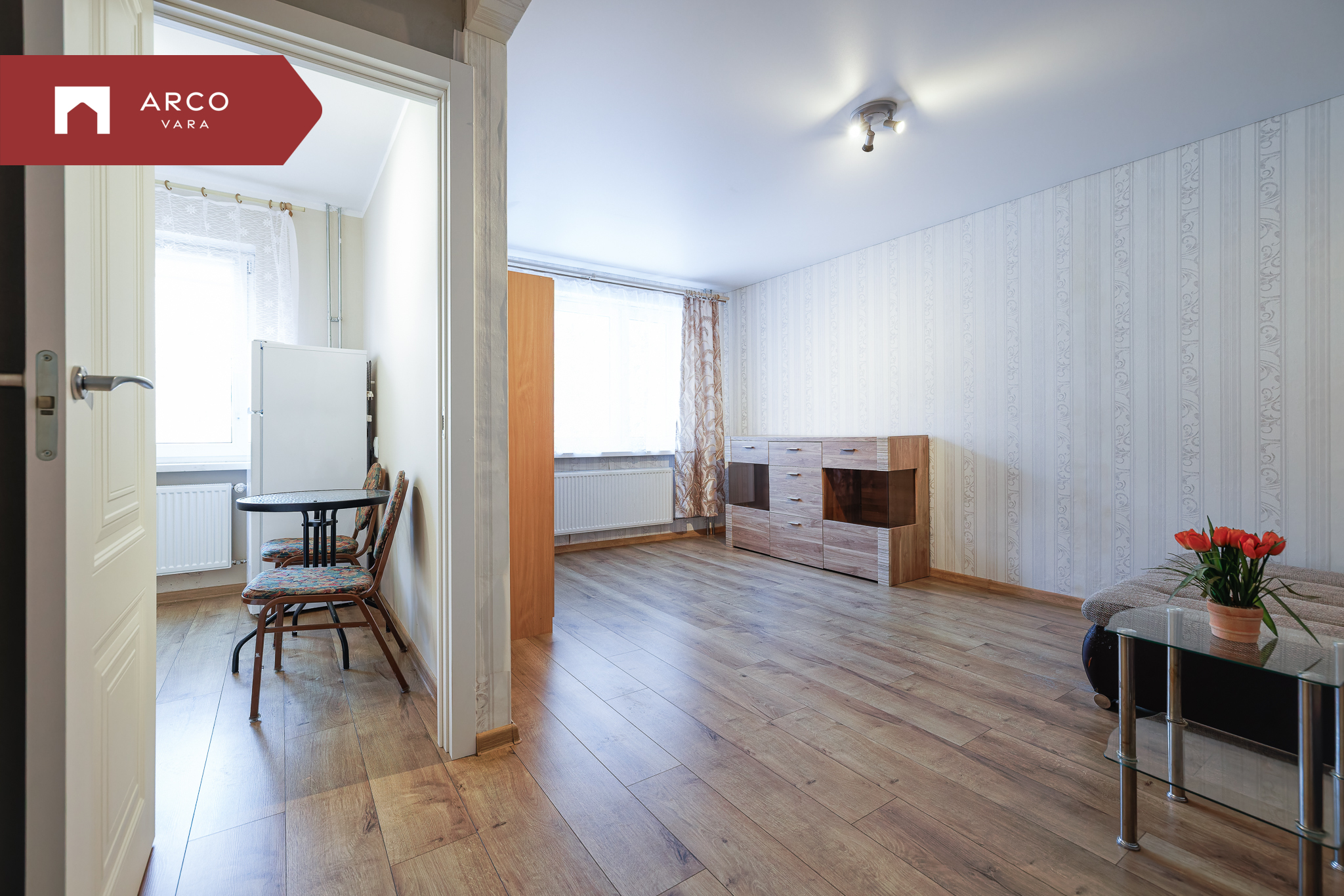 Korteril on mugav ja funktsionaalne planeering: köök, elutuba, vannituba.