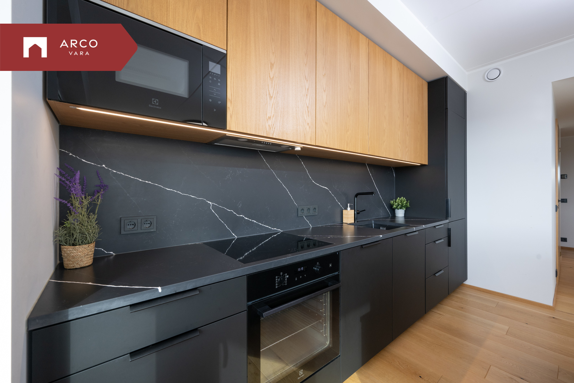Hinnas sisaldub kogu sisseehitatud mööbel esikus, vannitoas, panipaigas ja köögis koos kvaliteetse integreeritud köögitehnikaga. Köögi töötasapind on vastupidav kvartskivi ja köögisaare tasapind naturaalne tamm. Saarel asuvad mugavalt integreeritud pistikupesad, mis lisavad igapäevaelule mugavust.