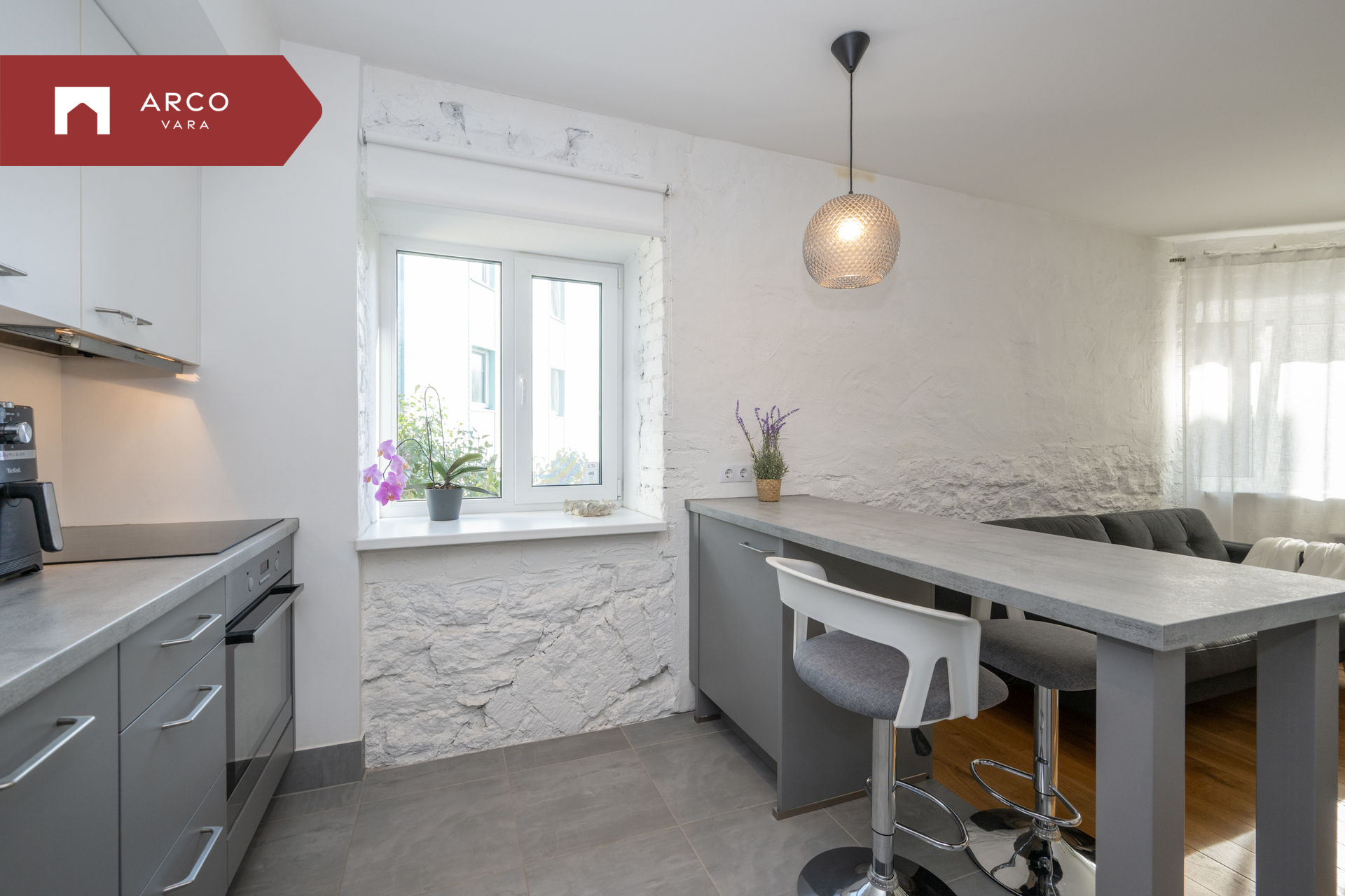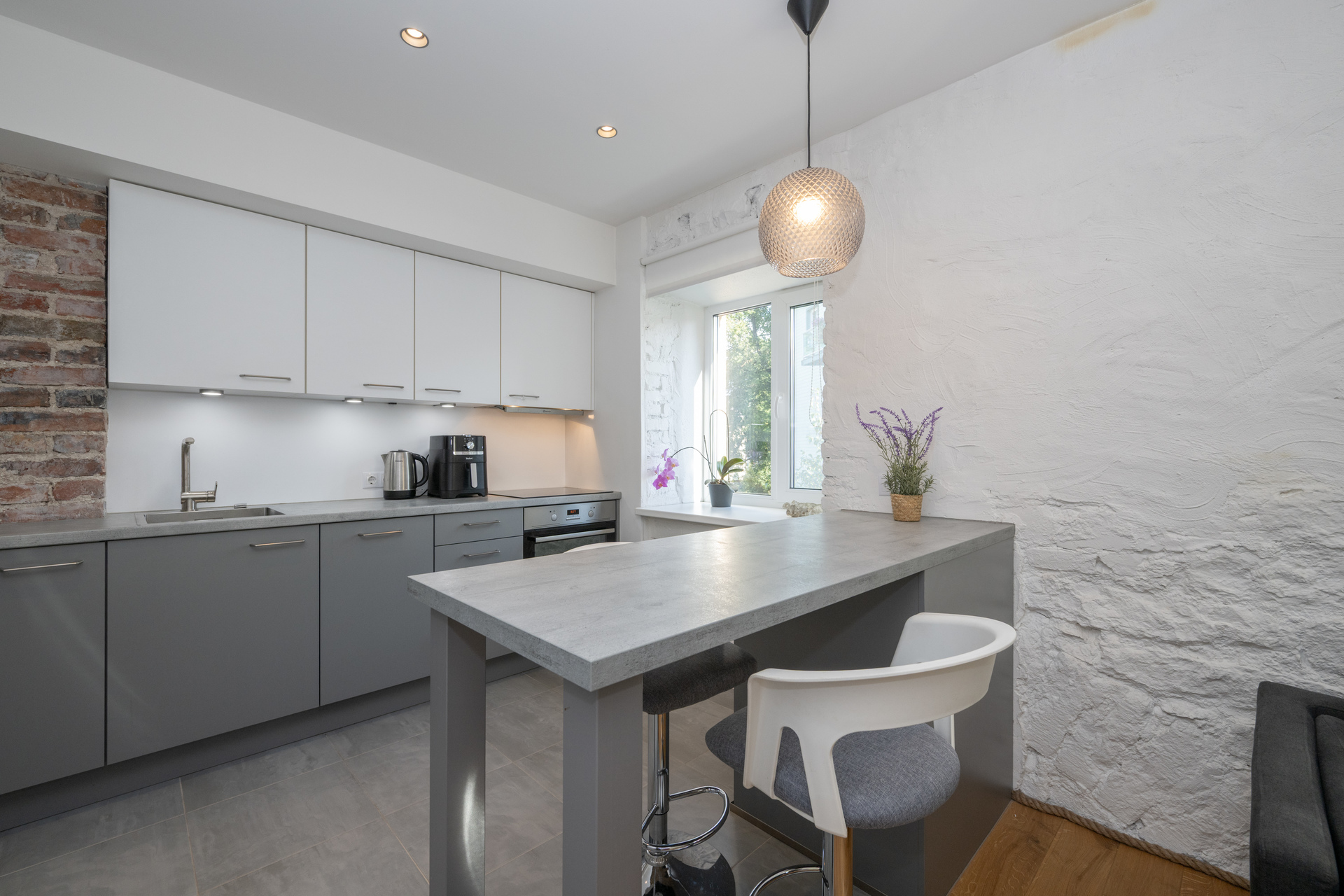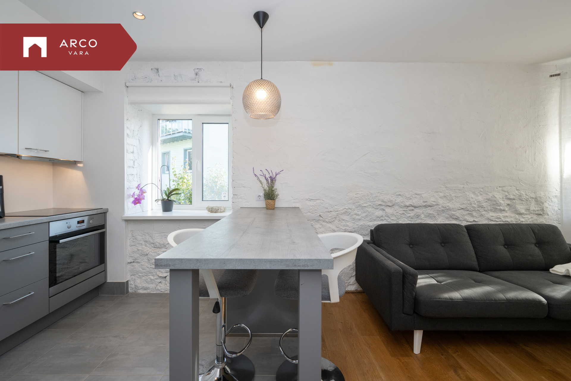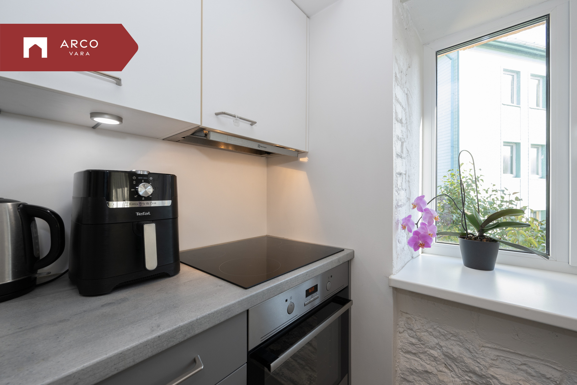 - avatud köök: integreeritud köögimööbel koos tehnikaga (keraamiline induktsioon pliit, ahi, kubu, nõudepesumasin), söögilaud (mille all on madal integreeritud külmik) koos 4 tooliga
