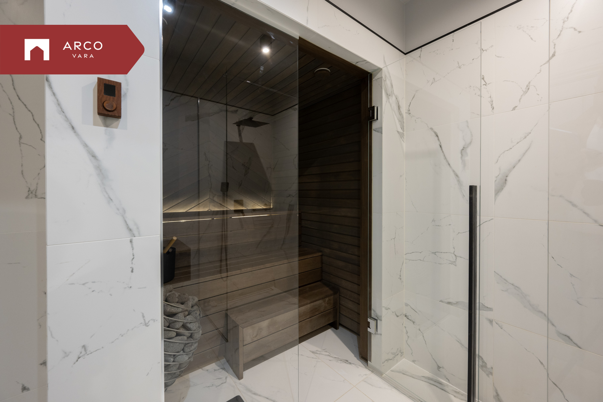 Saun ja pesuruum, kus on maitsekas kraanikauss ja Huumi elektriline saunakeris