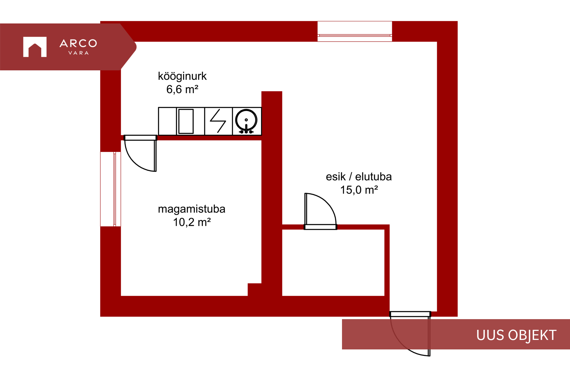 - 2 tuba: elutuba avatud köögiga ja eraldi magamistuba;