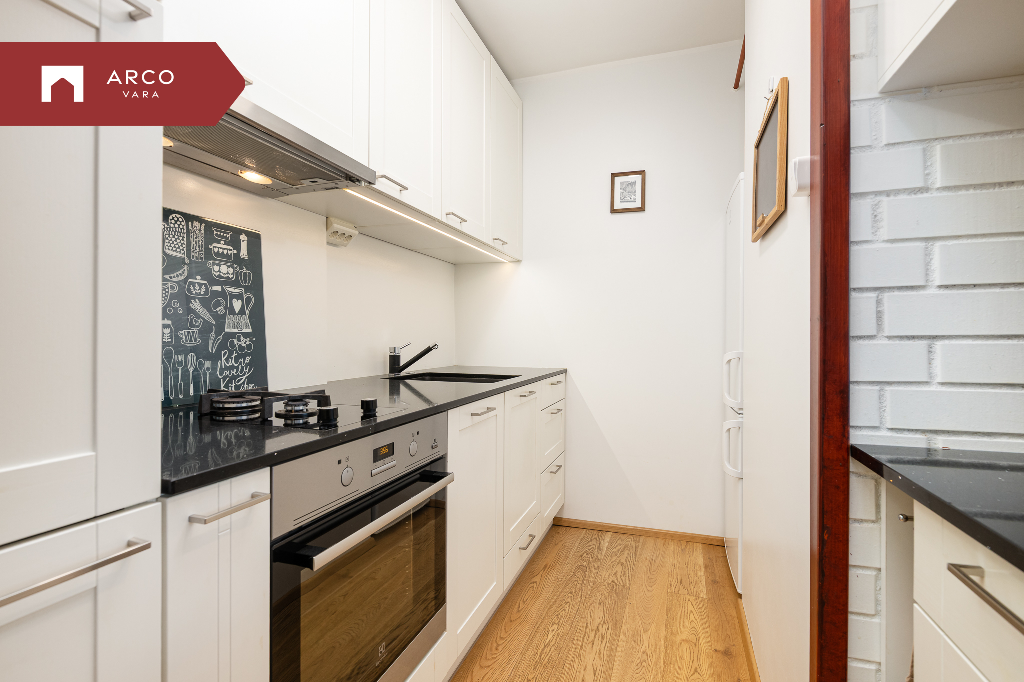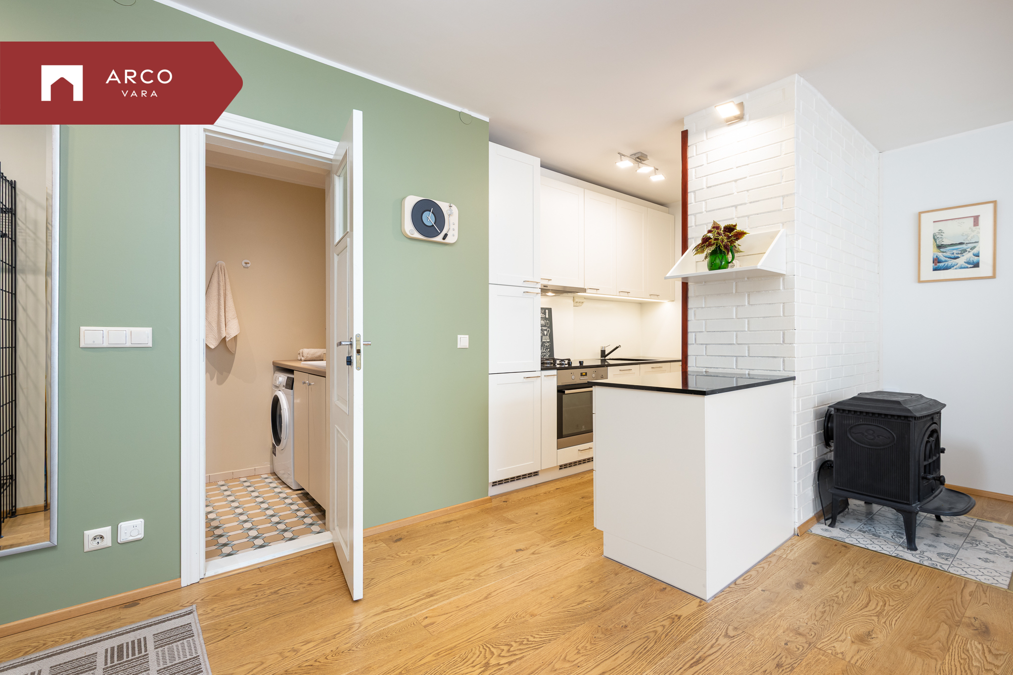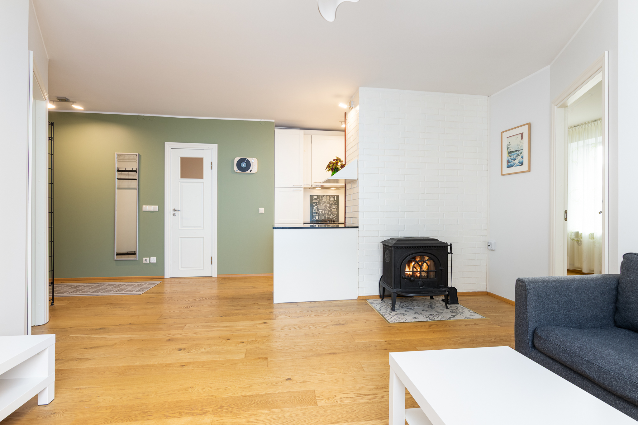 Elutoas on kamin, mis loob sooja ja hubase meeleolu. Lisaks elutoale on korteris kaks magamistuba, köök, mis paikneb mugavalt elutoa nurga taga, ning vannituba.