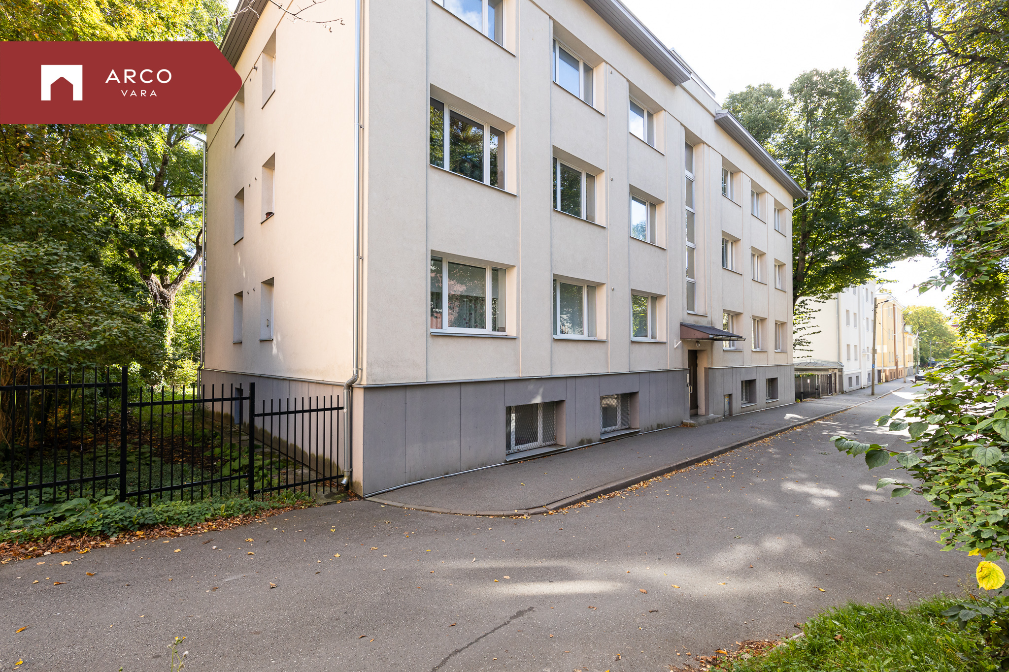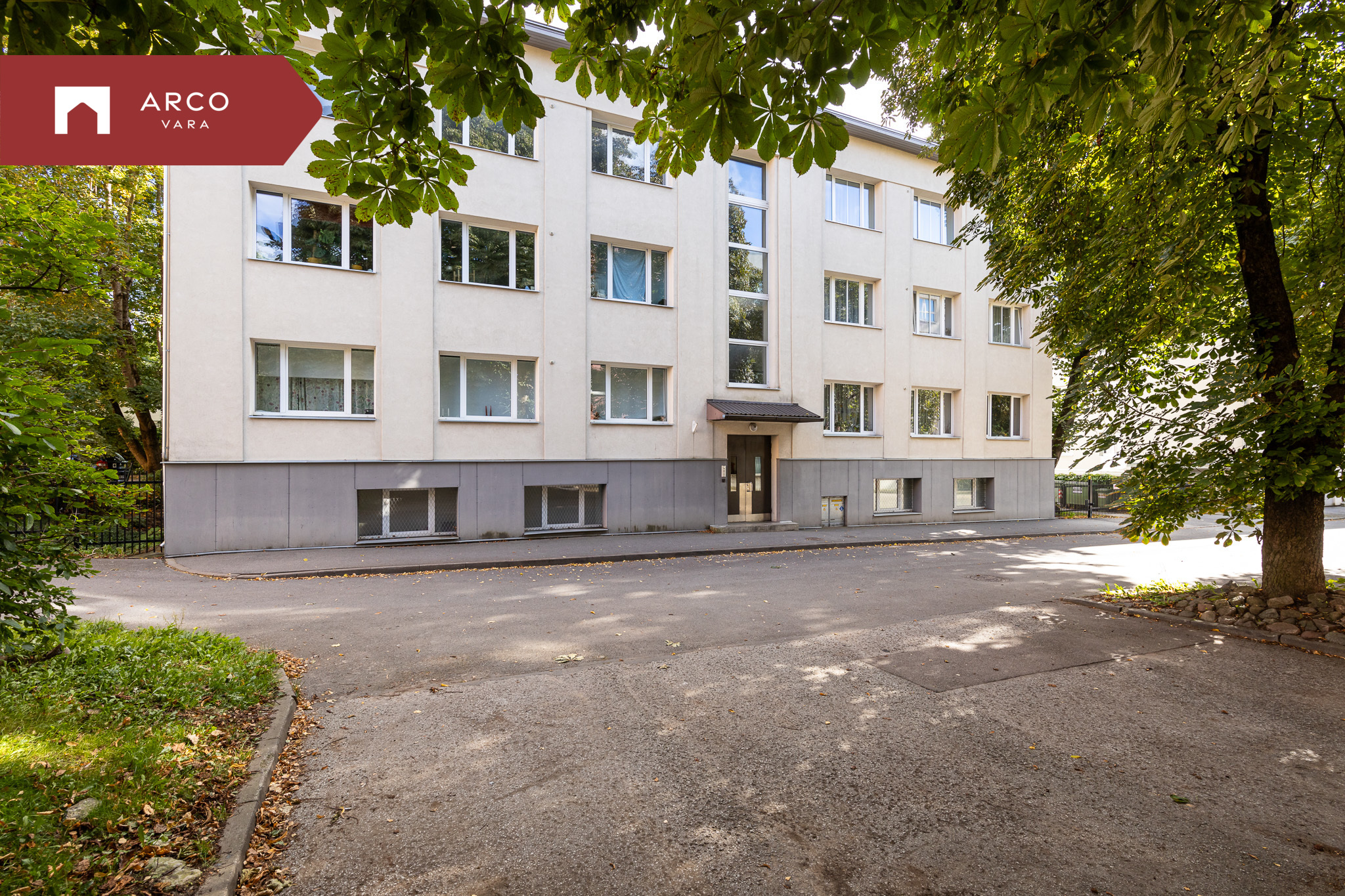 Maja ees kasvavad väärikad kastanipuud ning nende varjus on laste mänguväljak ja korvpalliplats.