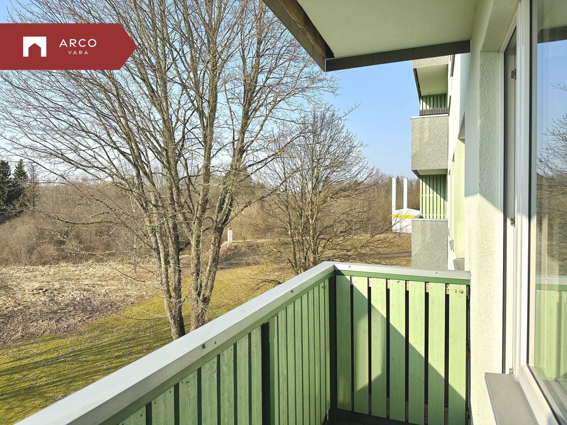 Elutoast uks rõdule, millelt avaneb kaunis vaade loodusele.