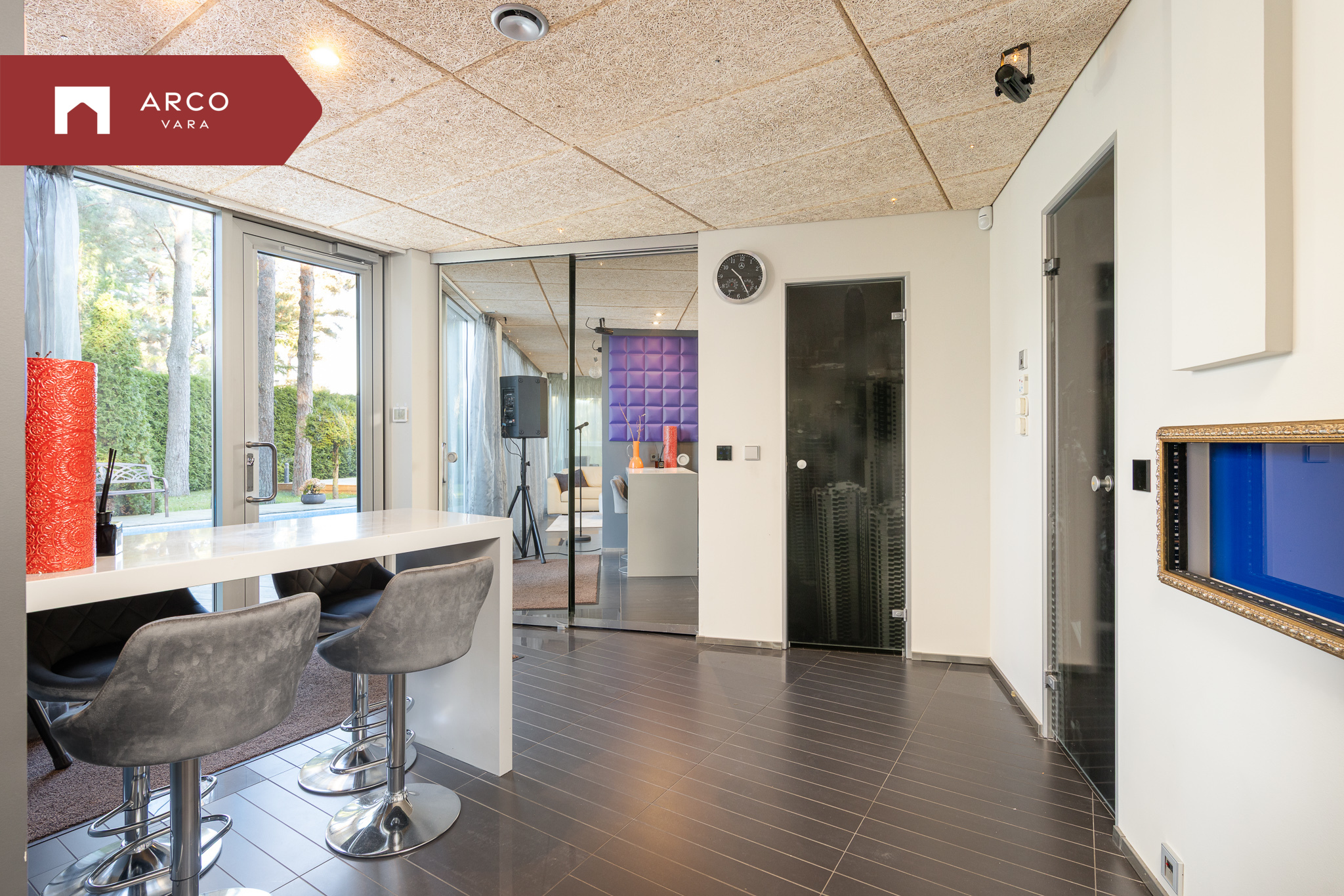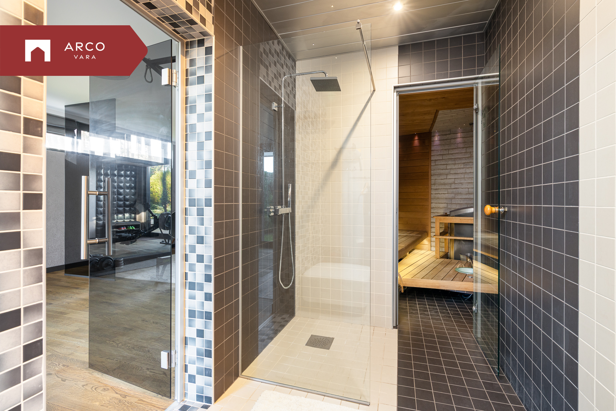 С террасы предусмотрен удобный проход в дом для отдыха, в котором расположены: тренажёрный зал, гостиная с кухонным уголком и закрытая терасса/отдыхательная зона.