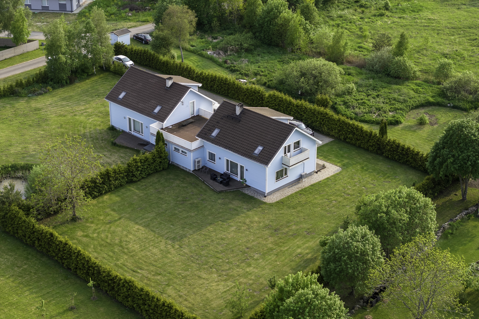 Paarismaja boksi suletud netopind on 187,5 m2, millele lisanduvad maja esine ja maja tagune terrass. Kinnistu on 3 338m2, millest müüdava paarismaja osa isiklik kasutusõigus on ca. 1500m2. Kinnistu on ilusti hooldatud ja haljastatud. Maja ees on boksi juurde kuuluv suur unikiviga kaetud parkimisala, kuhu mahub parkima vähemalt neli autot ning lisaks garaaž. Tegemist on tagumise boksiga ning kogu boksi juurde kuuluv ala on ümbritsetud kõrge elupuu hekiga, mis tagab täieliku privaatsuse. Samuti eraldab kahte boksi mõlema boksi garaazid, mistõttu on tegu sisuliselt eramajaga.