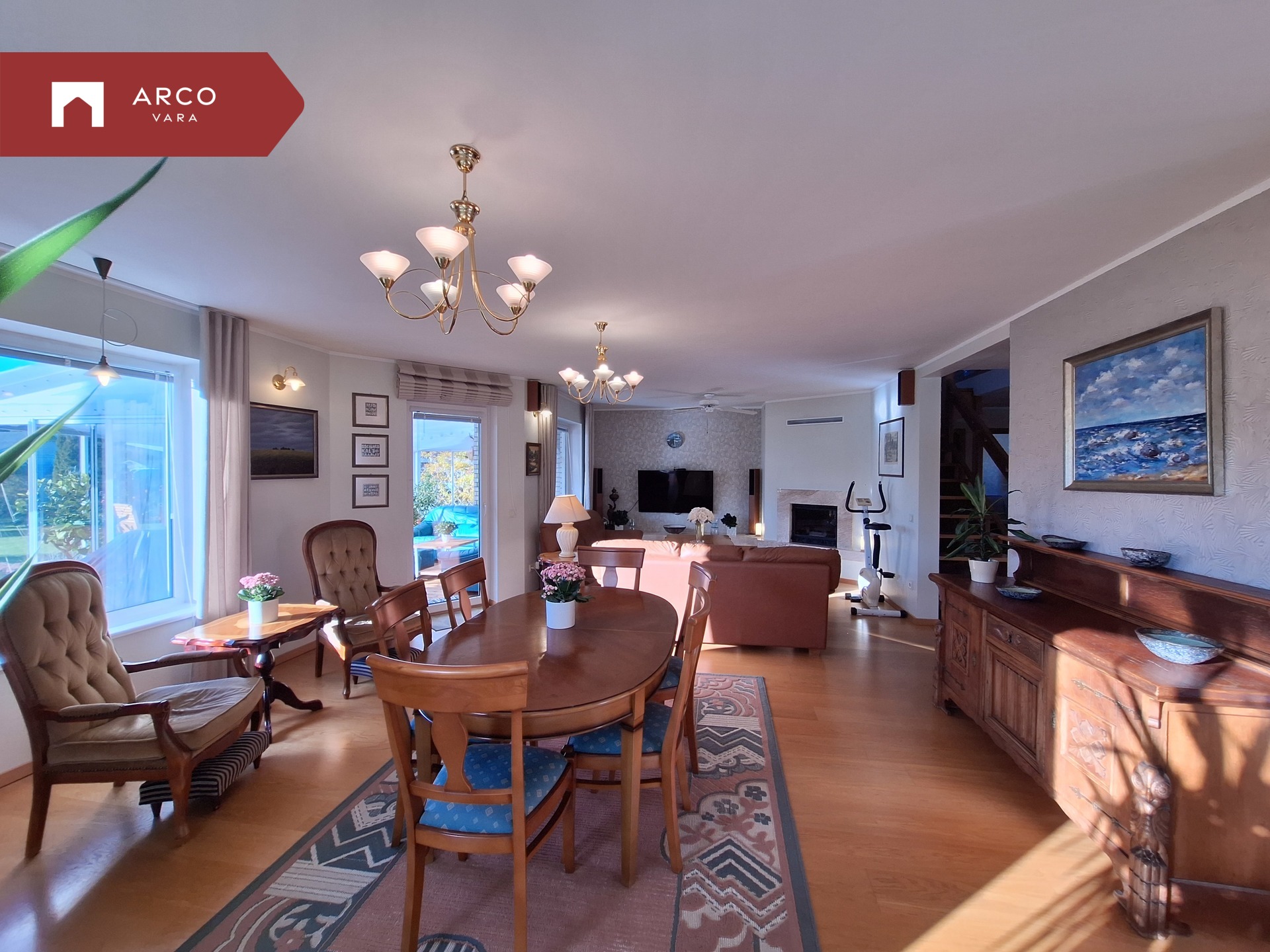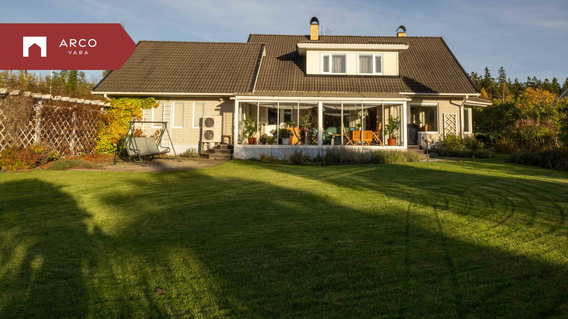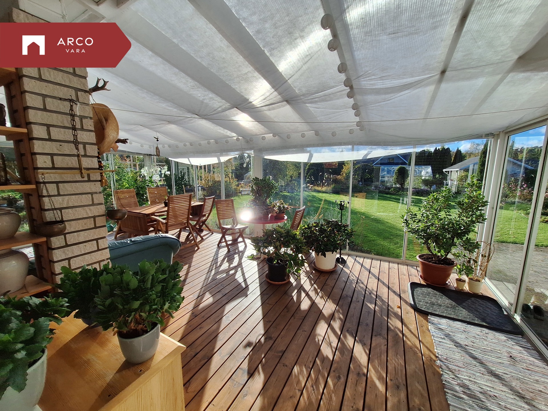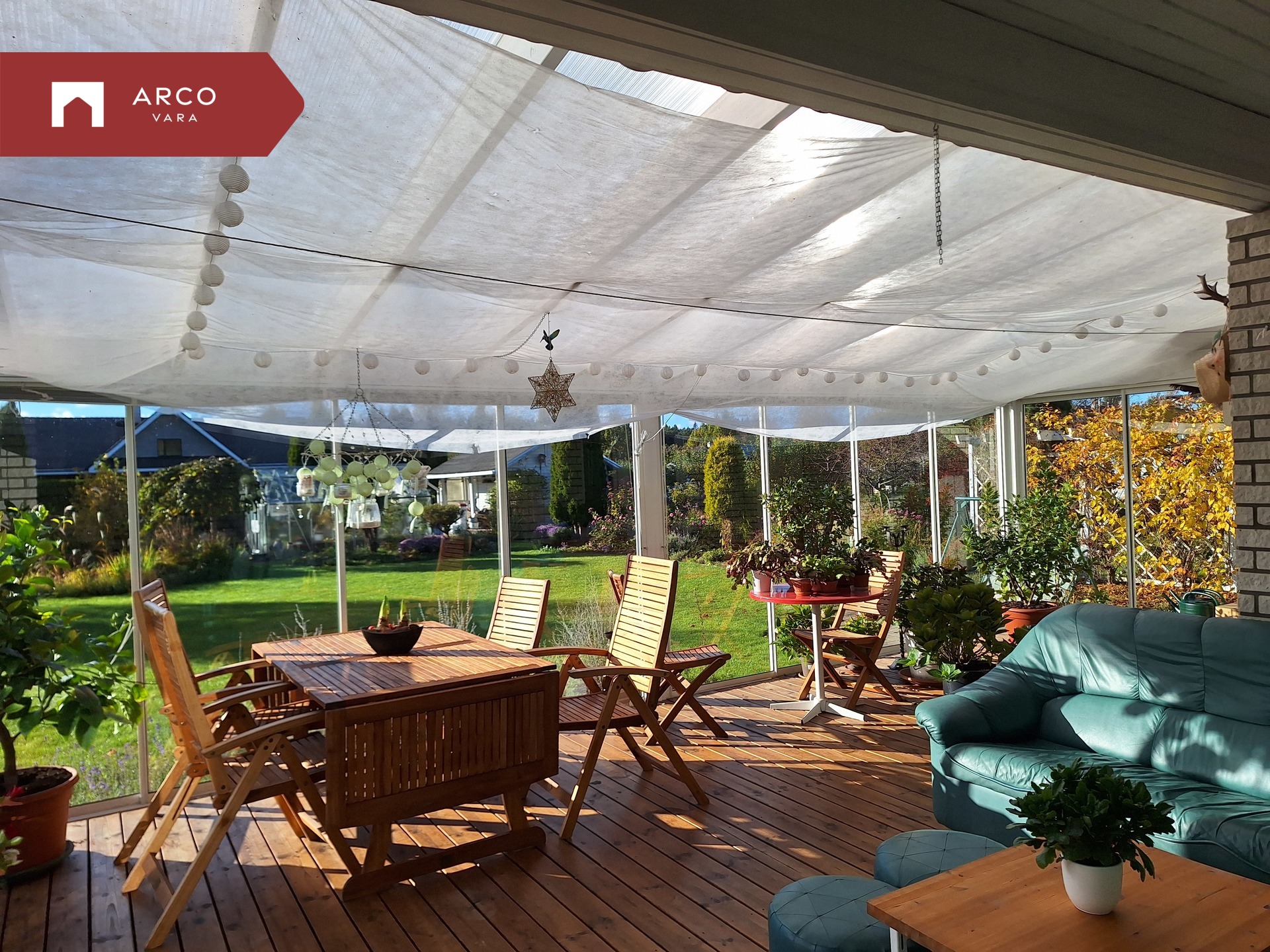 Living room opens to a glazed veranda (34.6 m²) with sliding glass walls and garden access