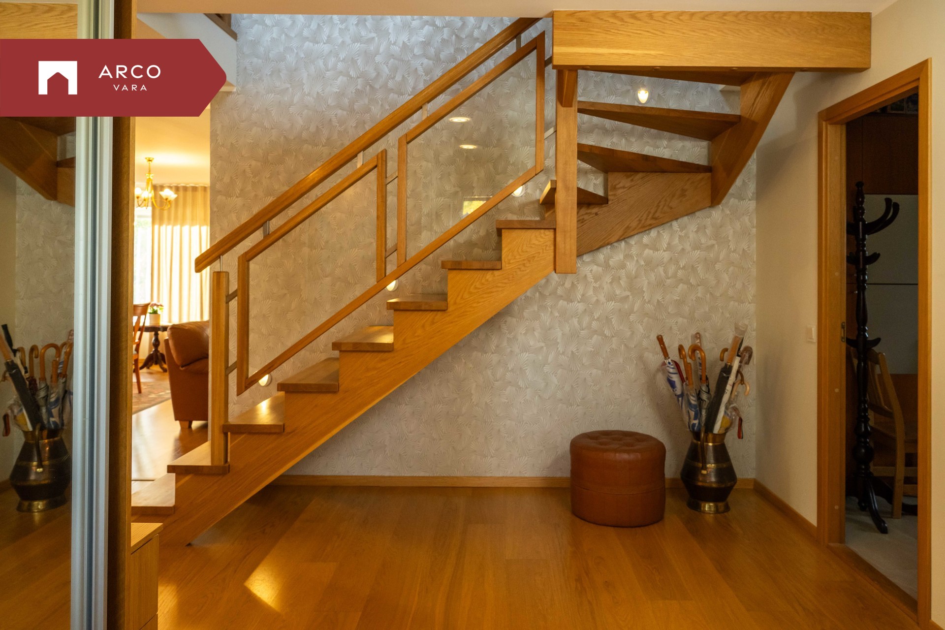 Spacious open foyer with solid oak staircase (step lighting)