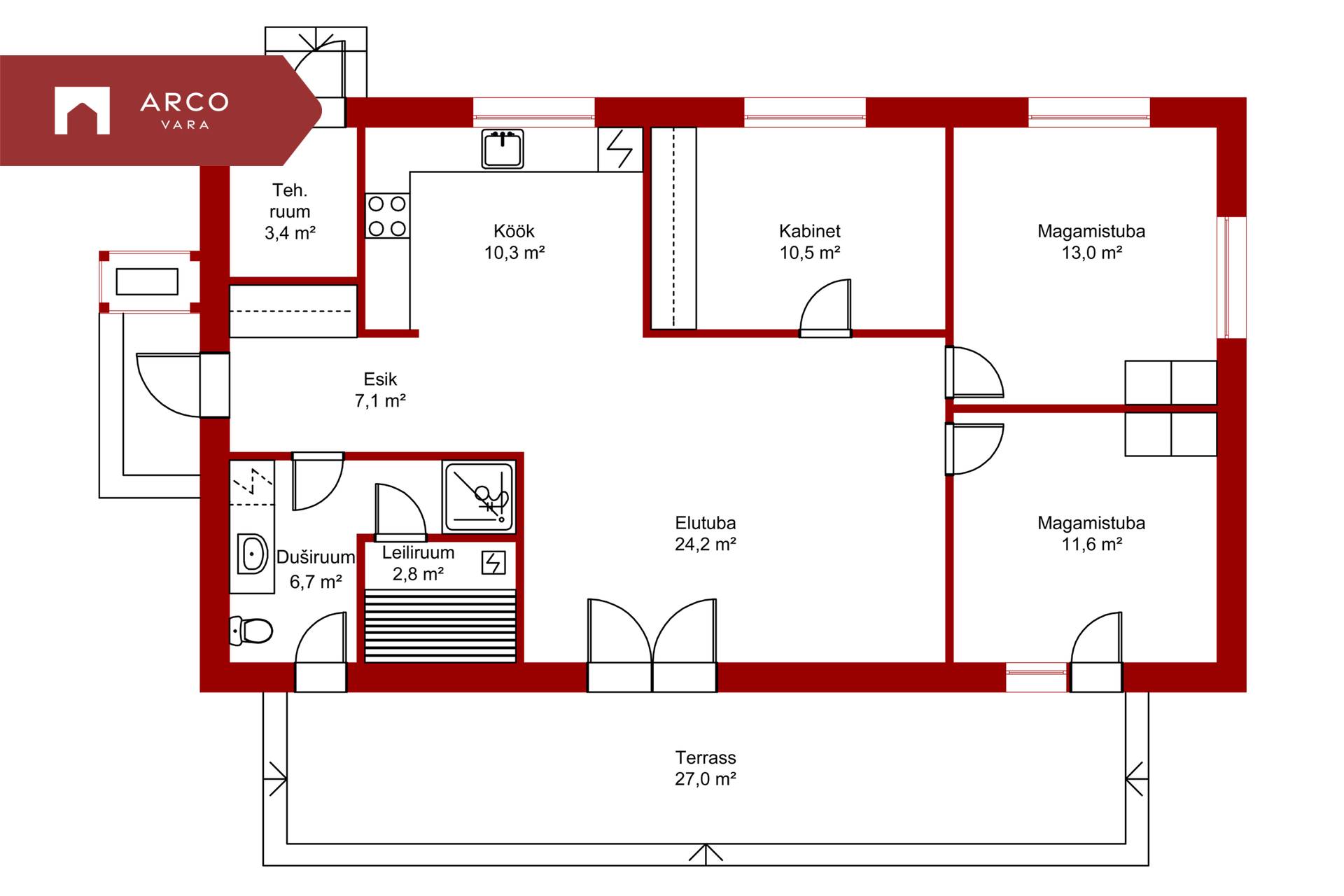 Majal on läbimõeldud ja funktsionaalne planeering. Esik 7,1 m2, avar elutuba 24,2 m2 on ühendatud köögiga 10,3 m2 ning sealt pääseb privaatsesse sisehoovi terrassile 27,0 m2. Majas on kolm eraldi magamistuba (11,6 m2; 13,0 m2; 10,5 m2).