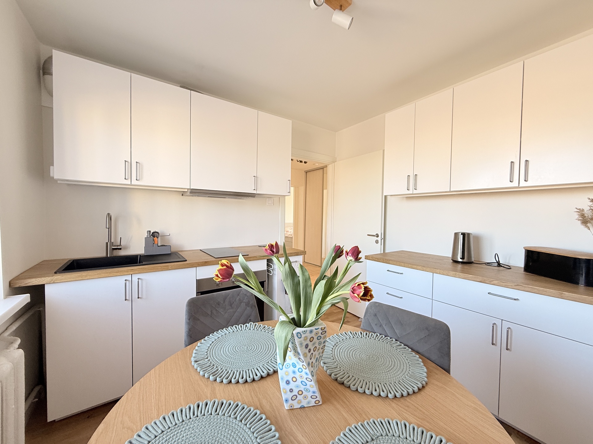 Korteri siseviimistlus on tehtud maitsekates ja kaasaegsetes heledates värvitoonides.