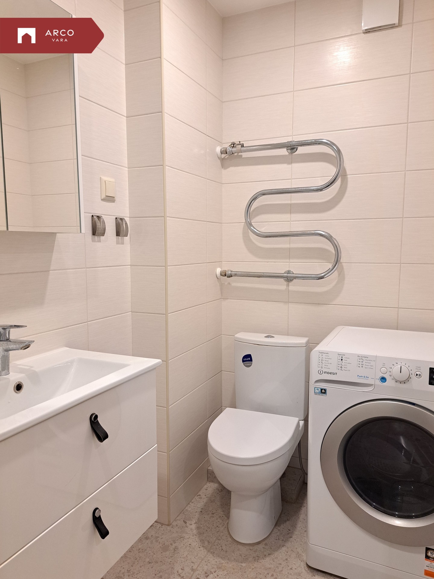 Stiilne vannituba, kus on olemas ka pesumasin-kuivati – ideaalne mugavus kiireks elutempoks.