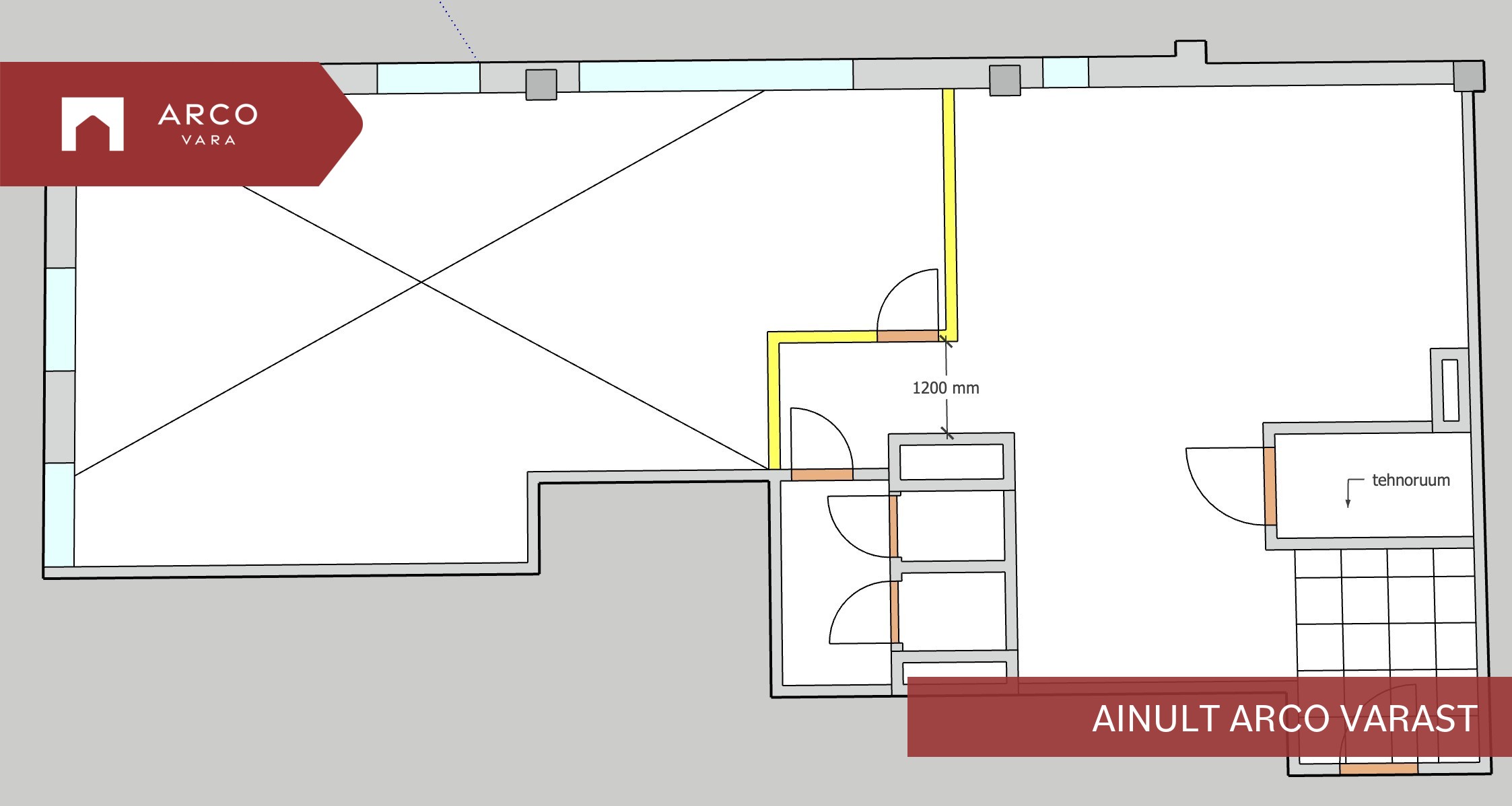 Hetkel on ruum jagatud kaheks kergvaheseinaga, mida on soovi korral võimalik ka eemaldada. Fotodel olev lahtine mööbel jm ei kuulu hinna sisse!