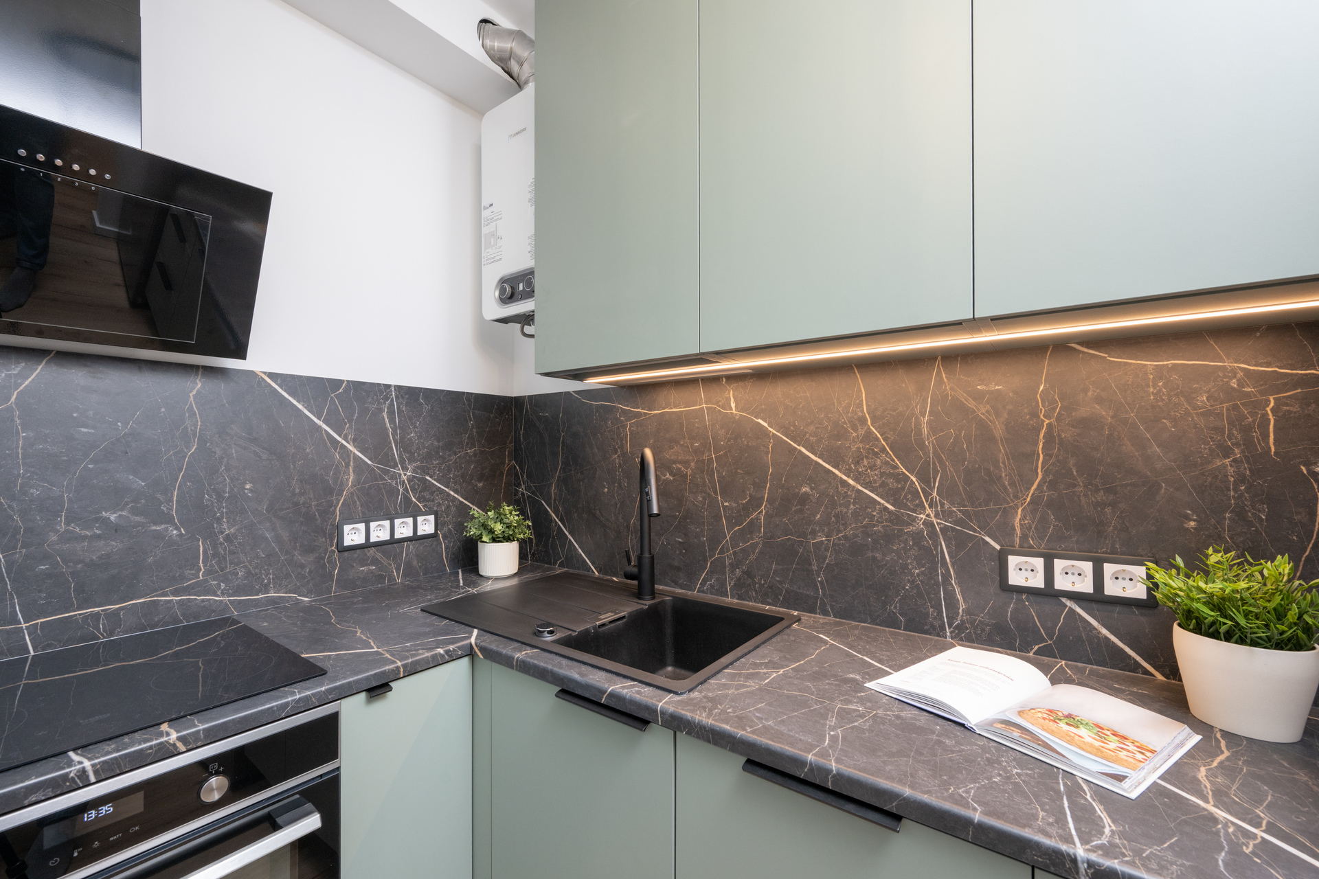 Köögis on uus mööbel koos kaasaegse tehnikaga (külmik, keraamiline pliit, ahi-mikrolaineahi, kubu, nõudepesumasin) ning piisavalt kappe ja sahtleid asjade paigutamiseks.