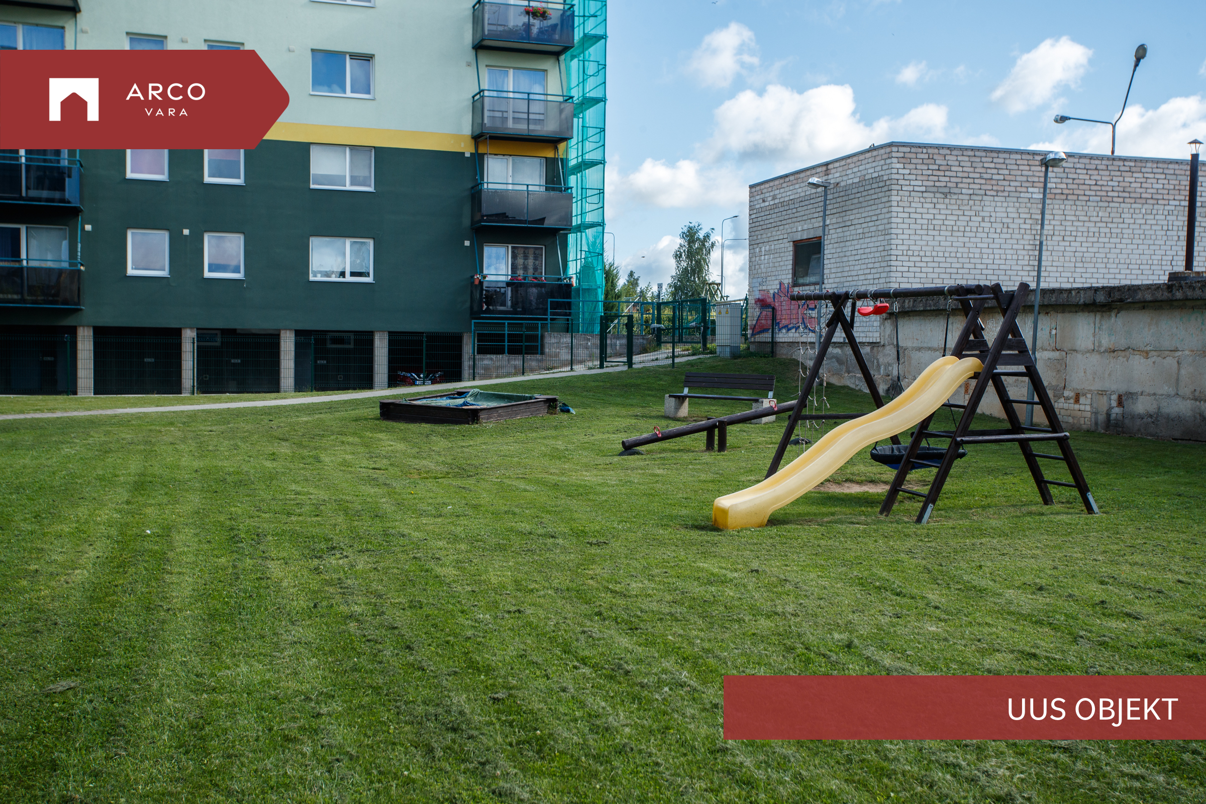 Maja taga asub muruplats koos laste mänguväljakuga, kus on liivakast, kiikumisvõimalused ning liumägi.