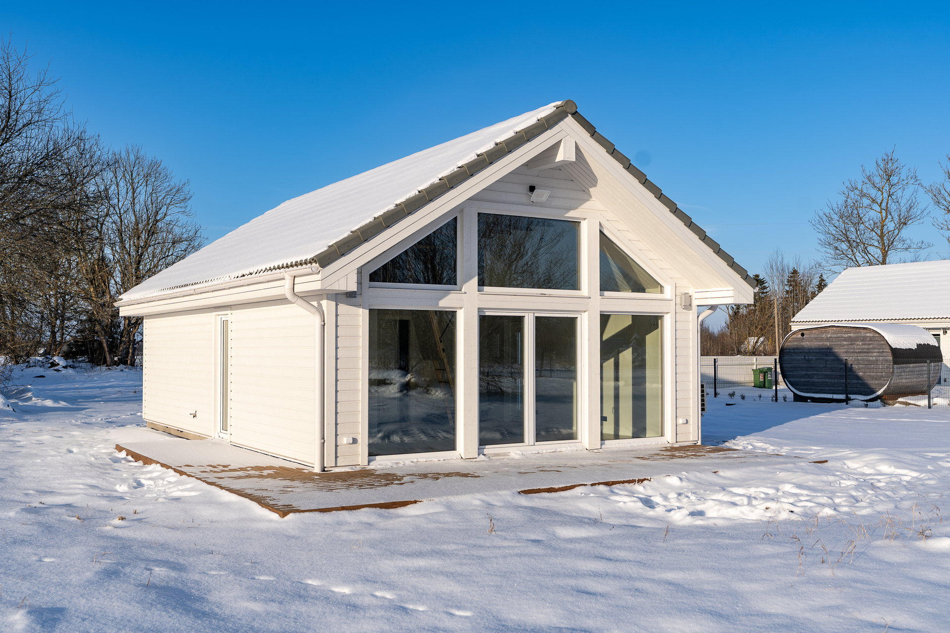 Arenduse värskeim näidismaja ootab neid, kes ei otsi lihtsalt nelja seina, vaid kodu, mis elab koos loodusega. Siin on iga aknavaade nagu postkaart ja iga hommik algab vaikuse sees. Talvised vaated piltidel on vaid üks peatükk — kevadel ärkab ümbrus rohelusse, suvel voolab valgus igasse tuppa ja sügisel krõbisevad lehed terrassi all. See on kodu, mis liigub koos aastaaegadega.