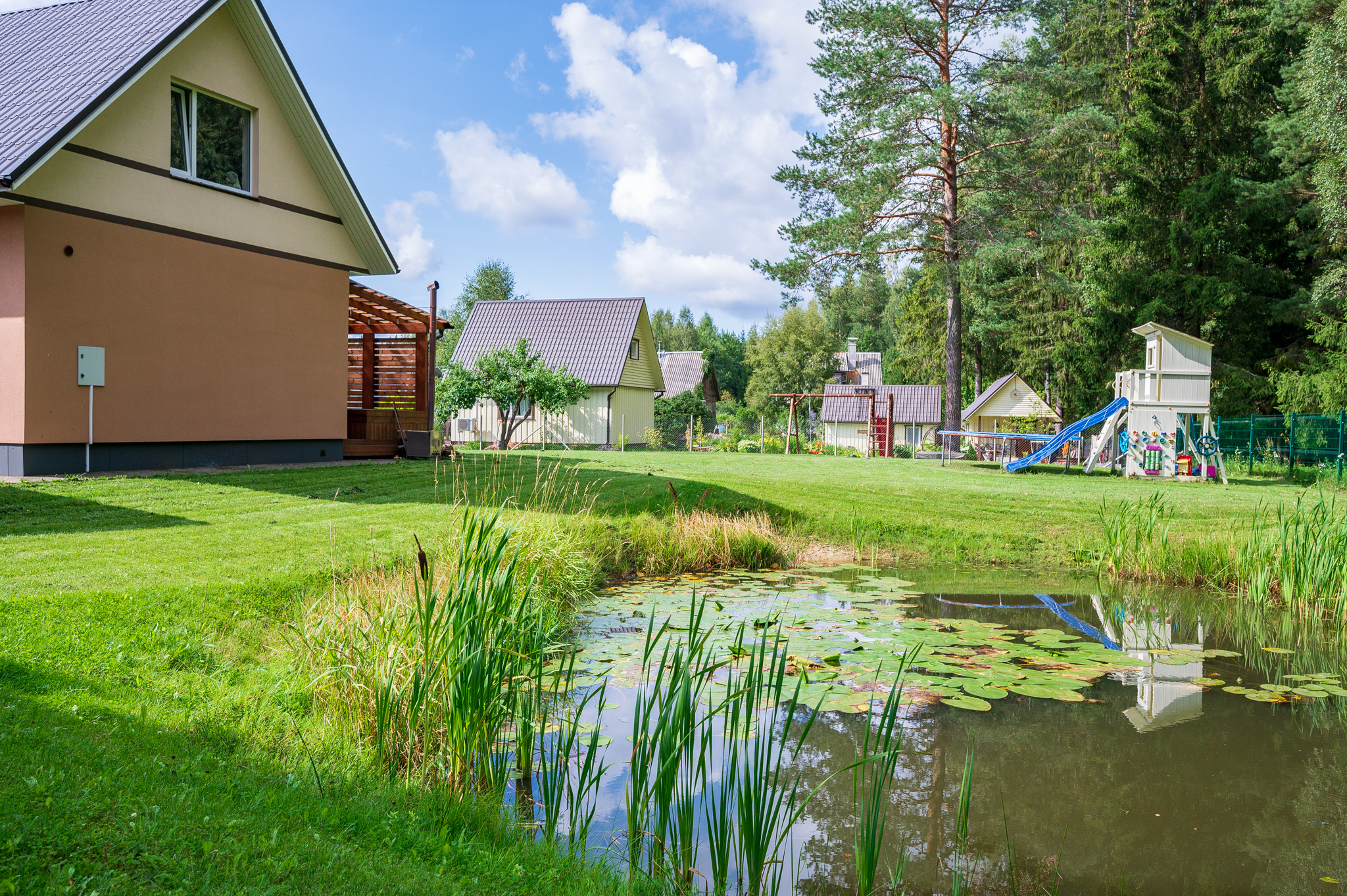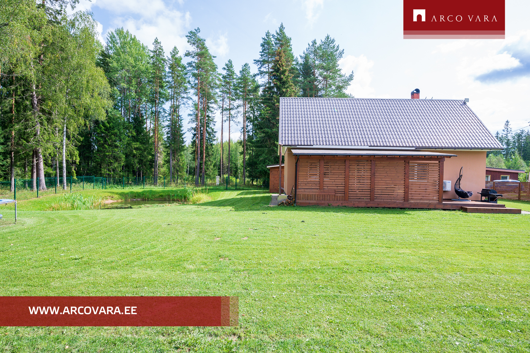 Suurem osa krundist on ümbritsetud aiaga, krundi kahel küljel on mets. Kinnistu on hooldatud ning tiik on süvendatud.