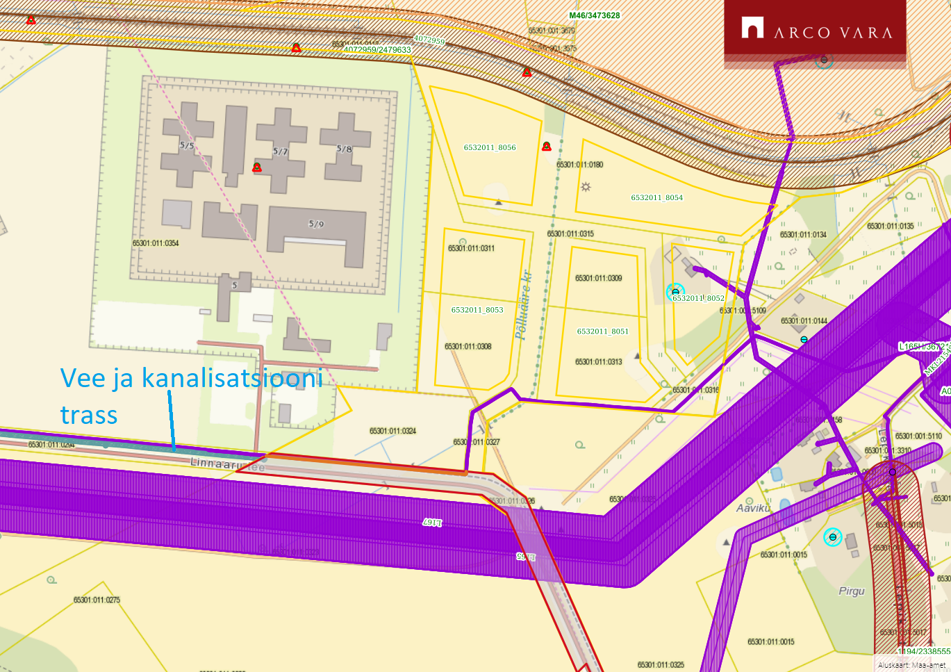 > vee- ja kanalisatsiooni trass asub 350m kaugusel (Linnaaru teel, suunaga Tallinna poole).