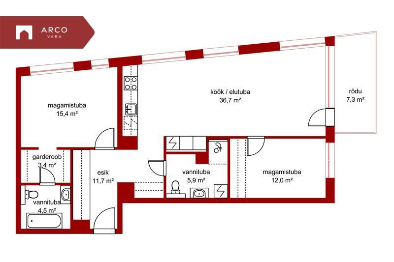 Magamistoast väljudes asub vasakul avar elutuba koos modernse kööginurga ja rõduga – ideaalne hommikukohviks või õhtuseks päikeseloojanguks. Elutoa kõrval paikneb lisatuba, mida saab kasutada külaliste toana, kontorina või lastetoana. Korteris on ka teine vannituba koos duši ja WC-ga – ideaalne külalistele või suuremale perele.
