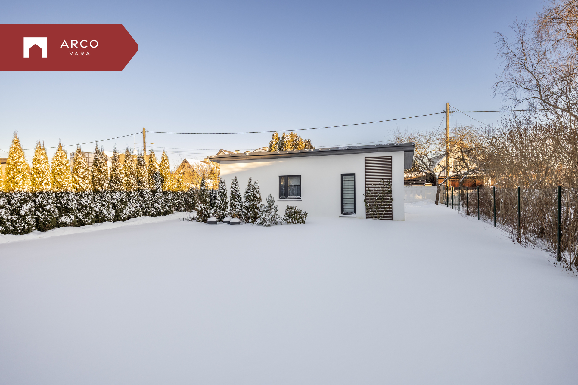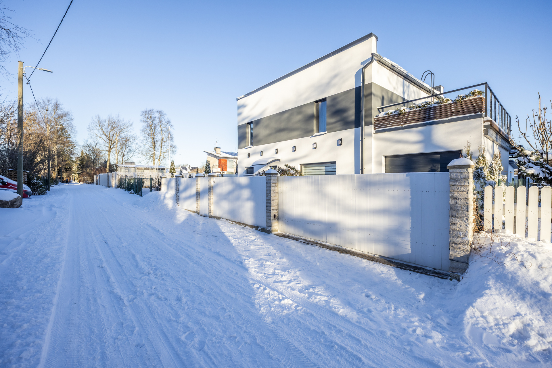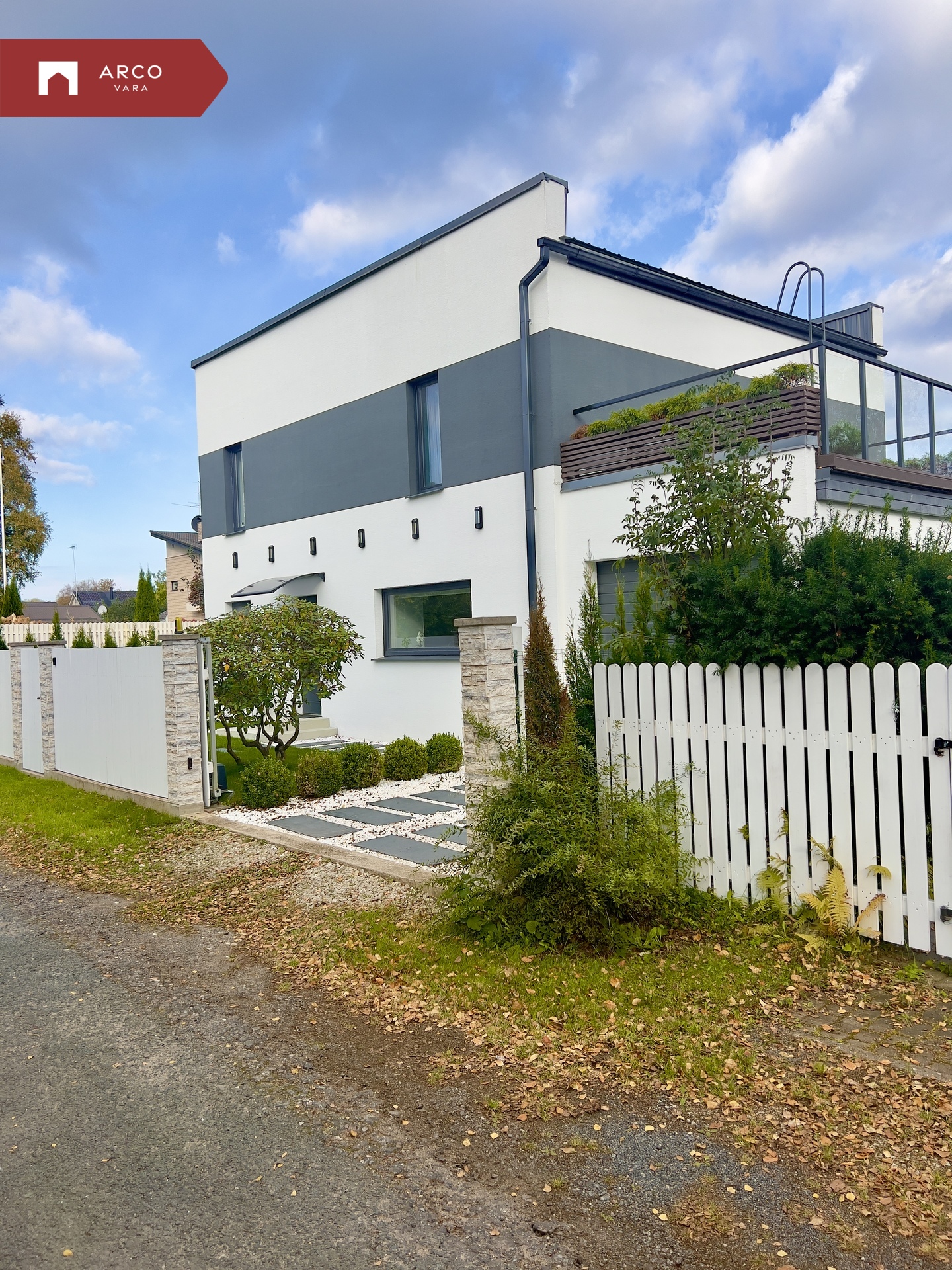 Krunt on ümbritsetud aiaga ja ühest küljest piiritletud kõrge elupuuhekiga. Mõlemalt poolt on ligipääsuks jalgväravad ja puldist avatavad autoväravad. Jalgtee ja garaaži esine on kaetud valgete dekoratiivkivide ja plaatidega.