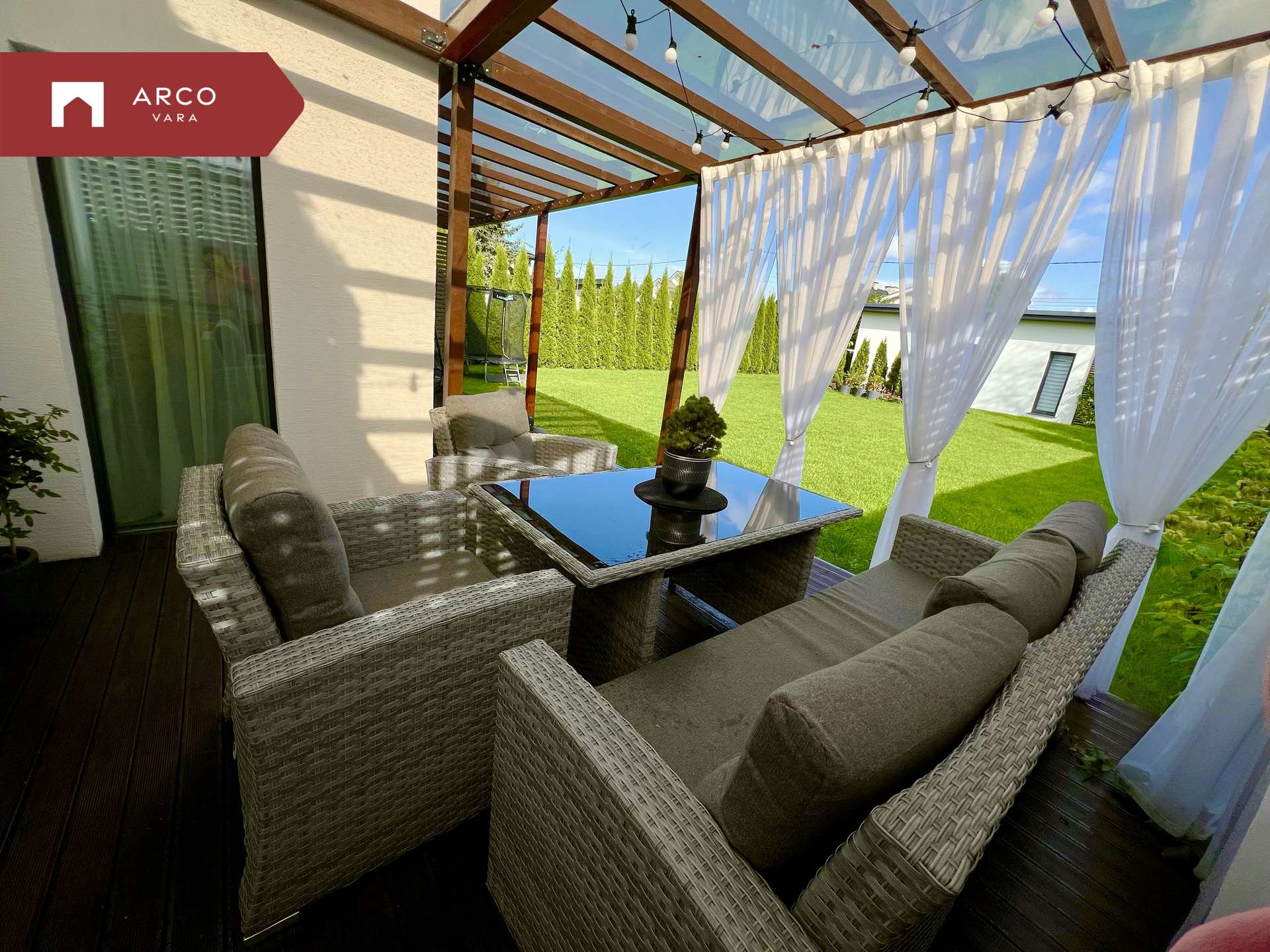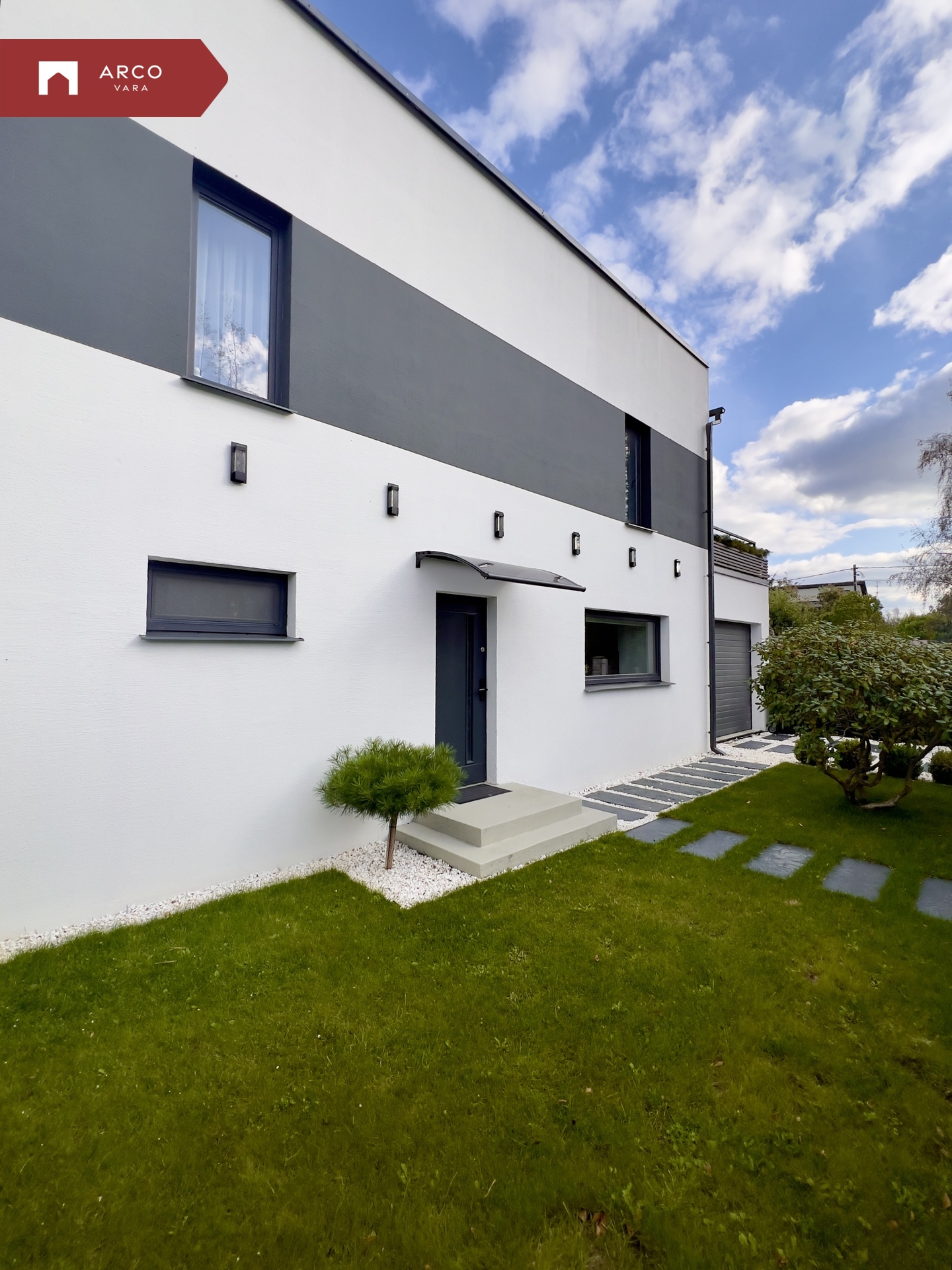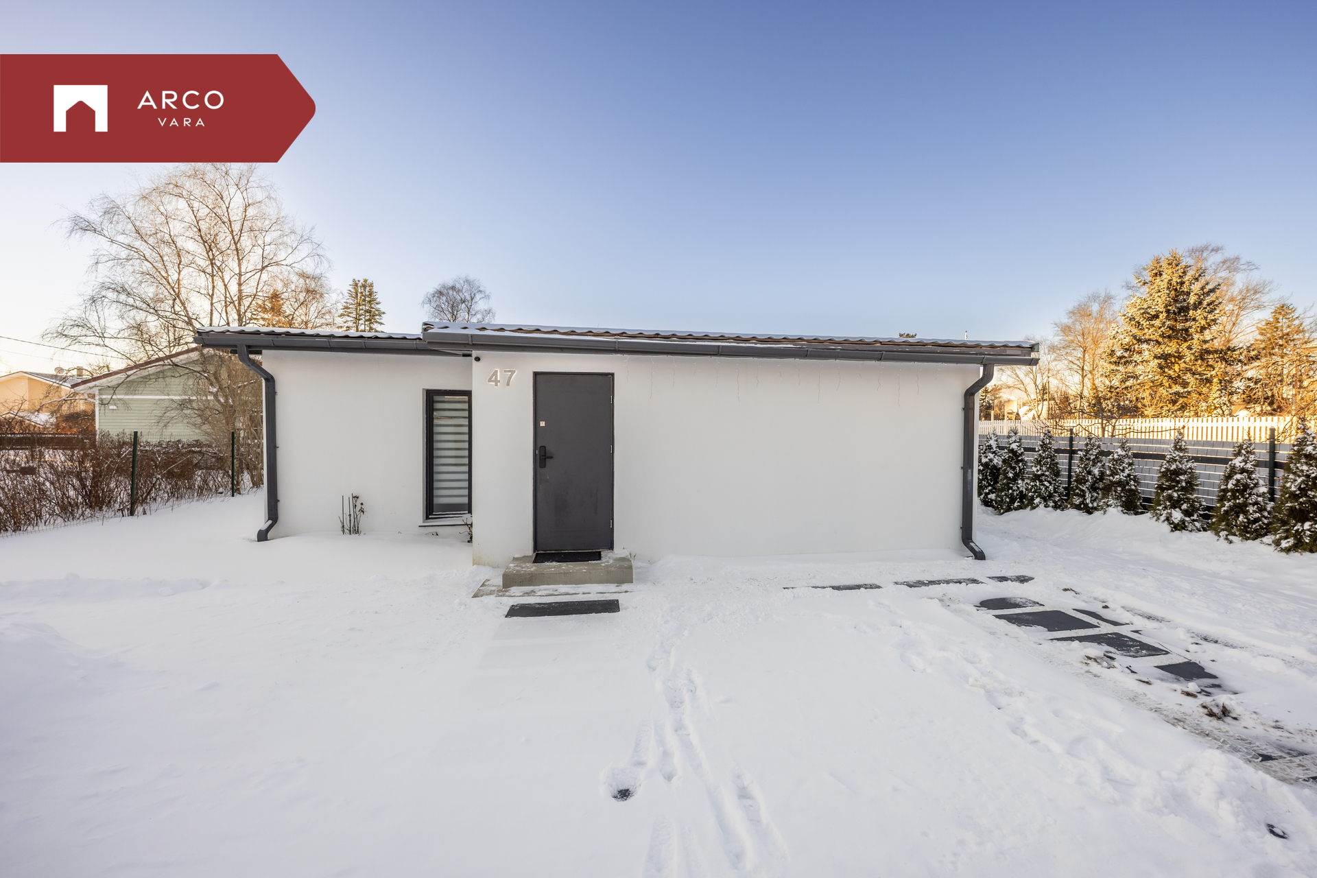 Krunt on ümbritsetud aiaga ja ühest küljest piiritletud kõrge elupuuhekiga. Mõlemalt poolt on ligipääsuks jalgväravad ja puldist avatavad autoväravad. Jalgtee ja garaaži esine on kaetud valgete dekoratiivkivide ja plaatidega.