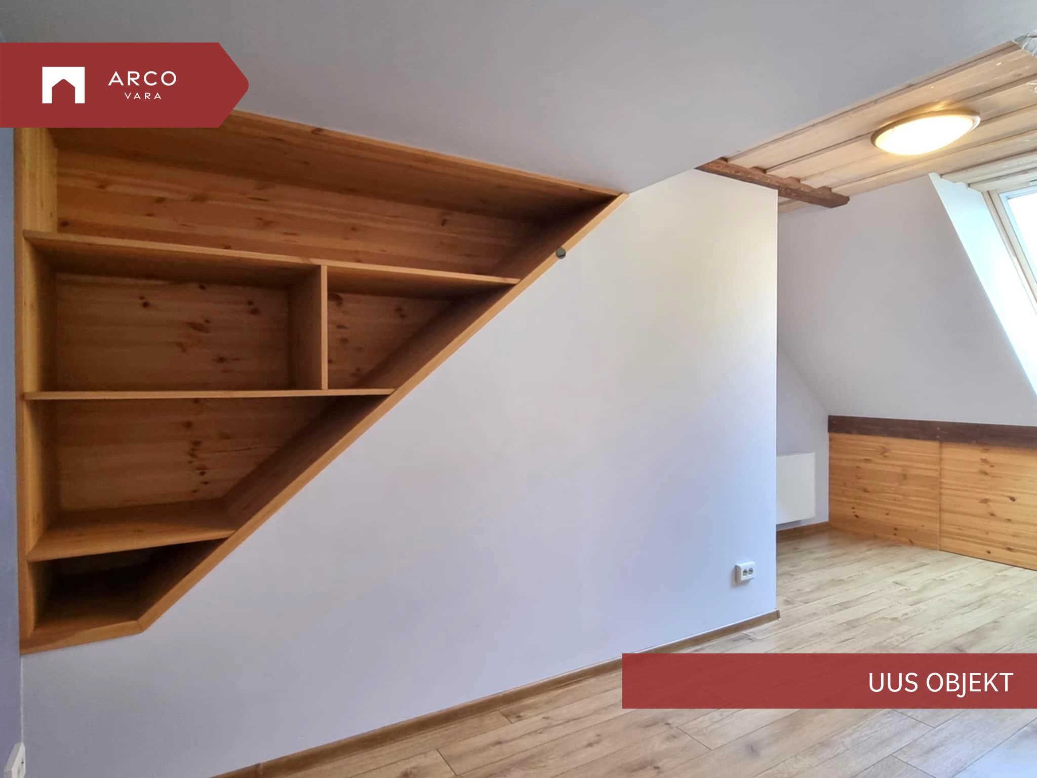 Teisel korrusel magamistuba, lükandustega seinakapid, seinariiulid, katuseaken.