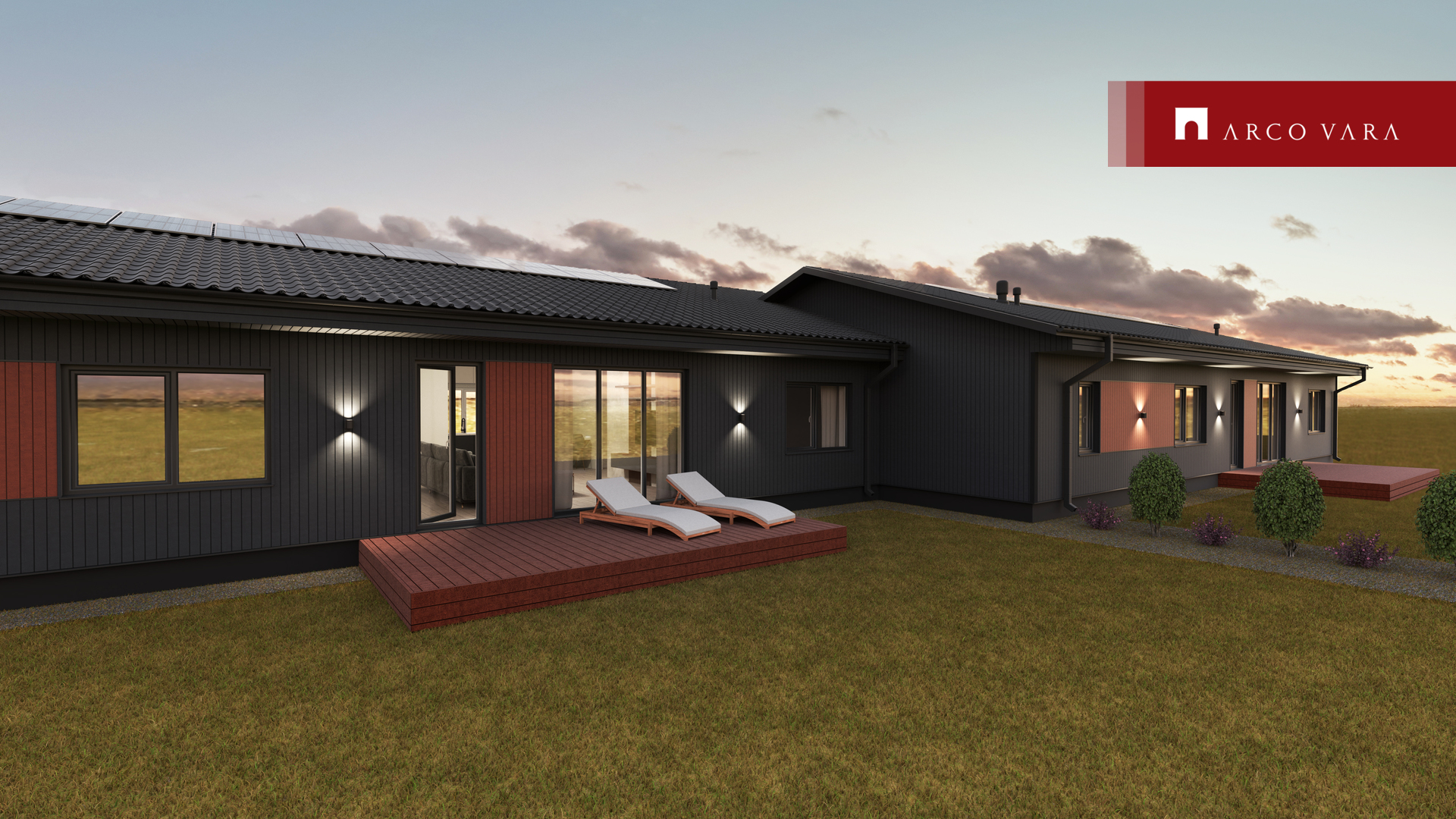 Avar, maast laeni akendega, avatud köögiga ja läbi maja planeeringuga elutuba, 4 magamistuba, suur tehnoruum/panipaik, kaks WC'd ja vannituba/duširuum ning saun ja ruumikas esik.