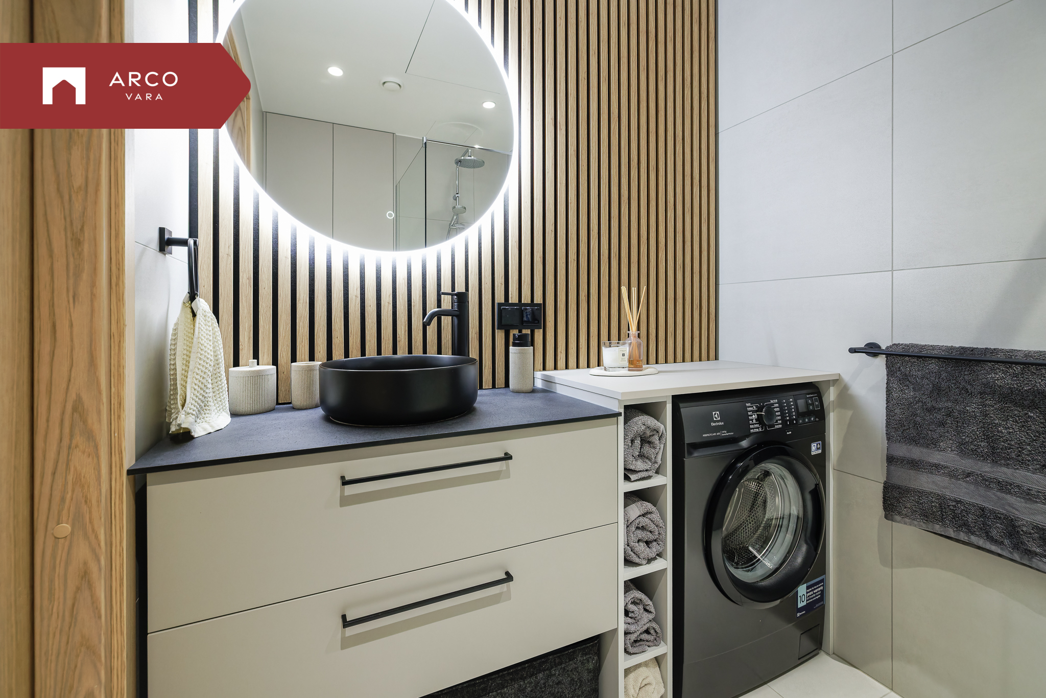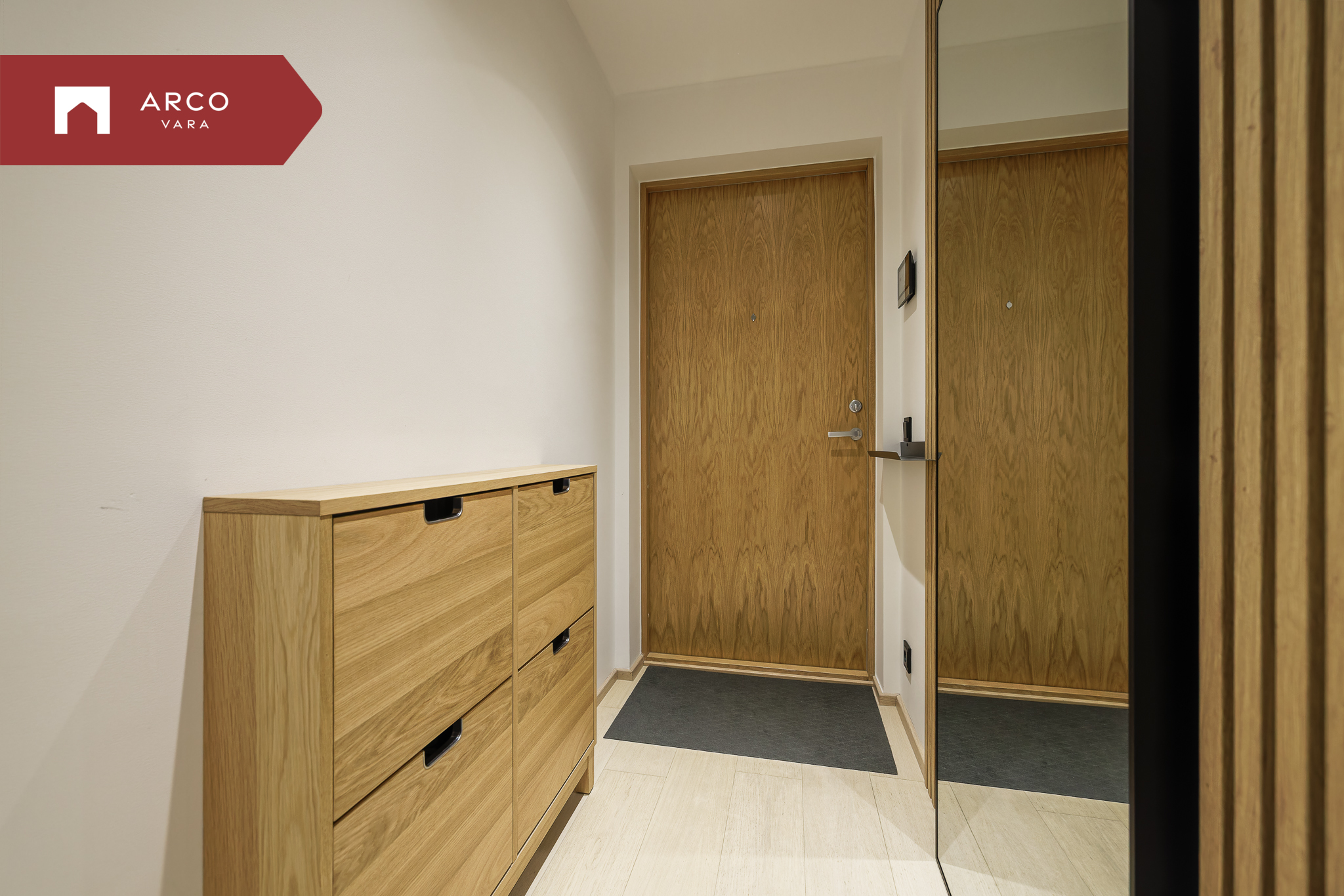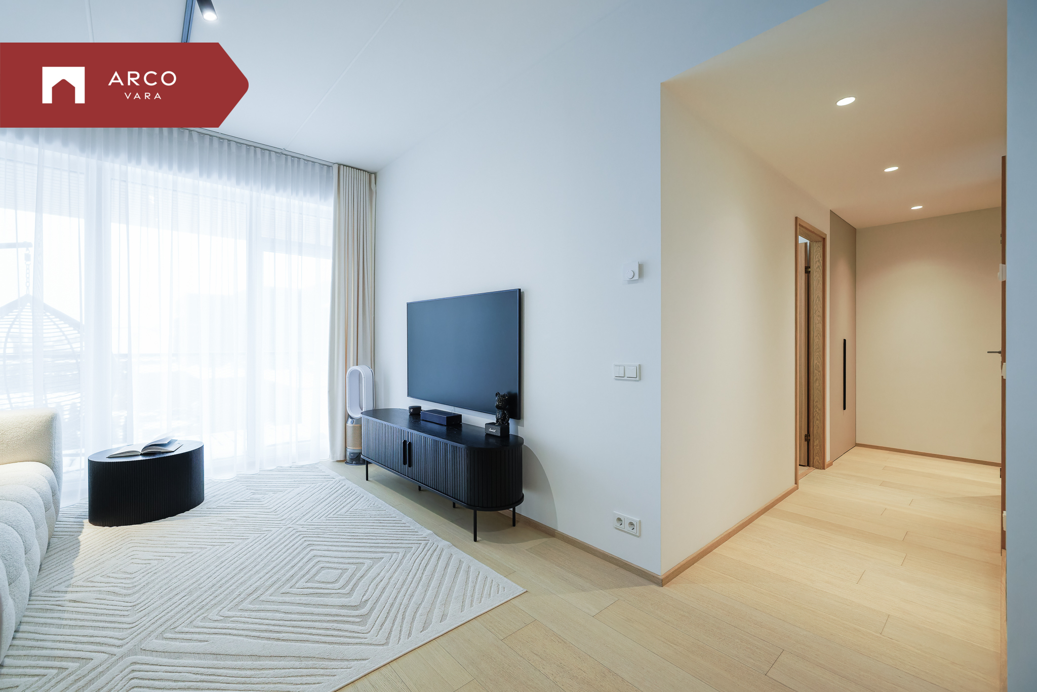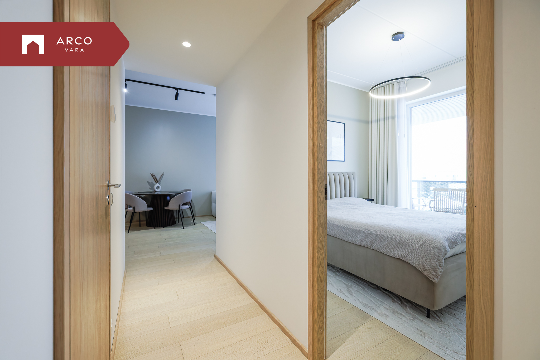 Interjöör on kujundatud soojades ja naturaalsetes toonides: puidutekstuurid, läbimõeldud valgustus ja kvaliteetne disainmööbel loovad avara ja rahuliku atmosfääri.