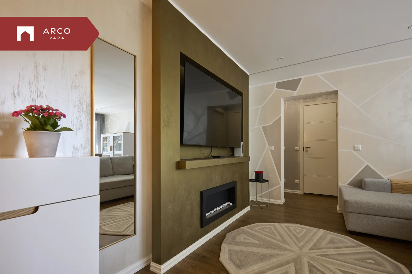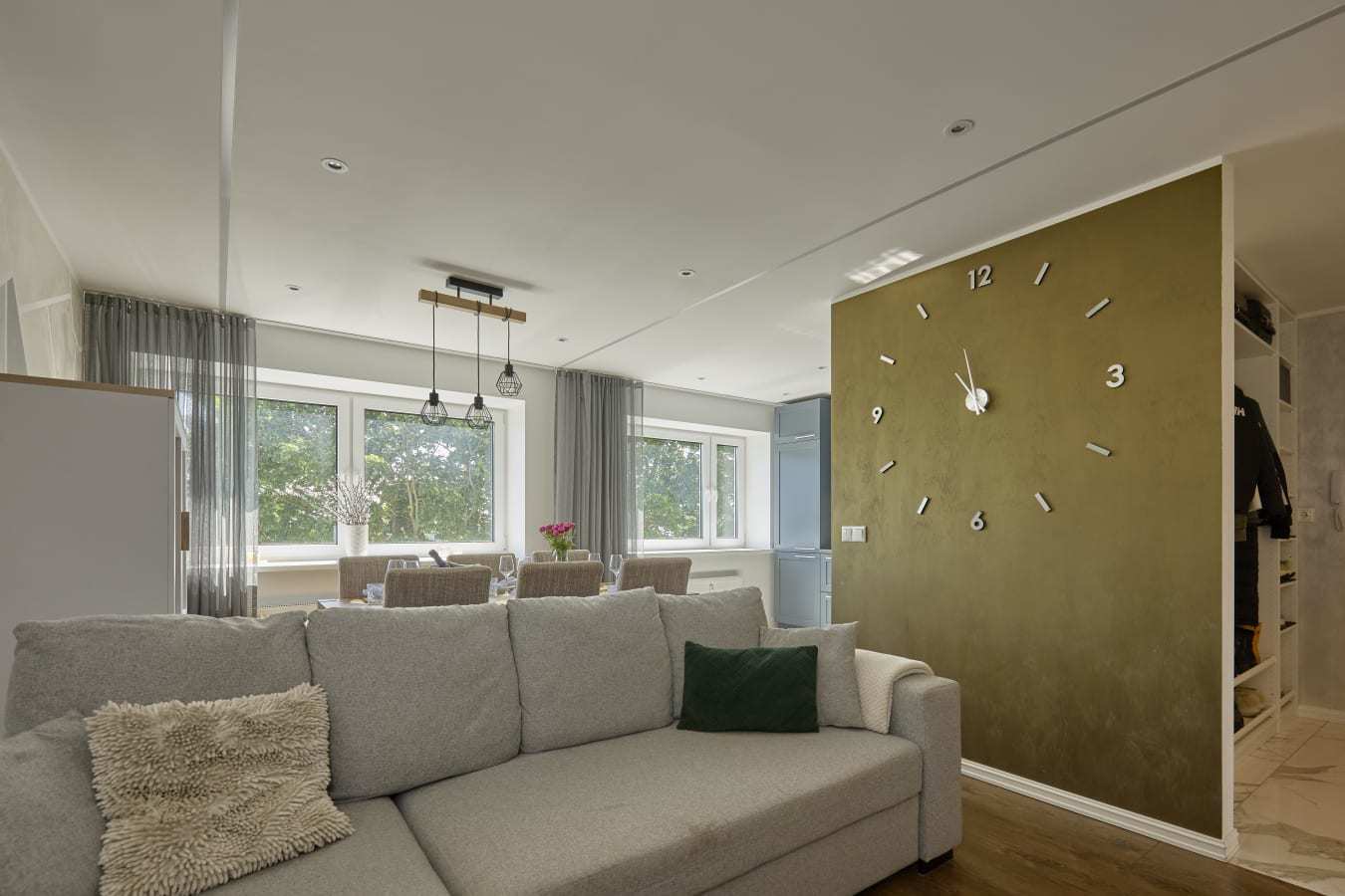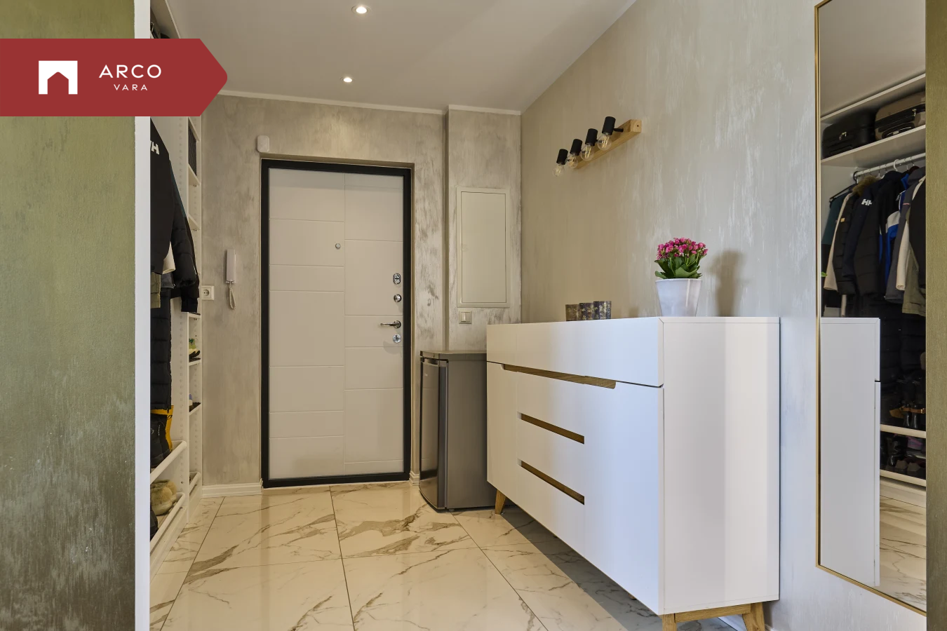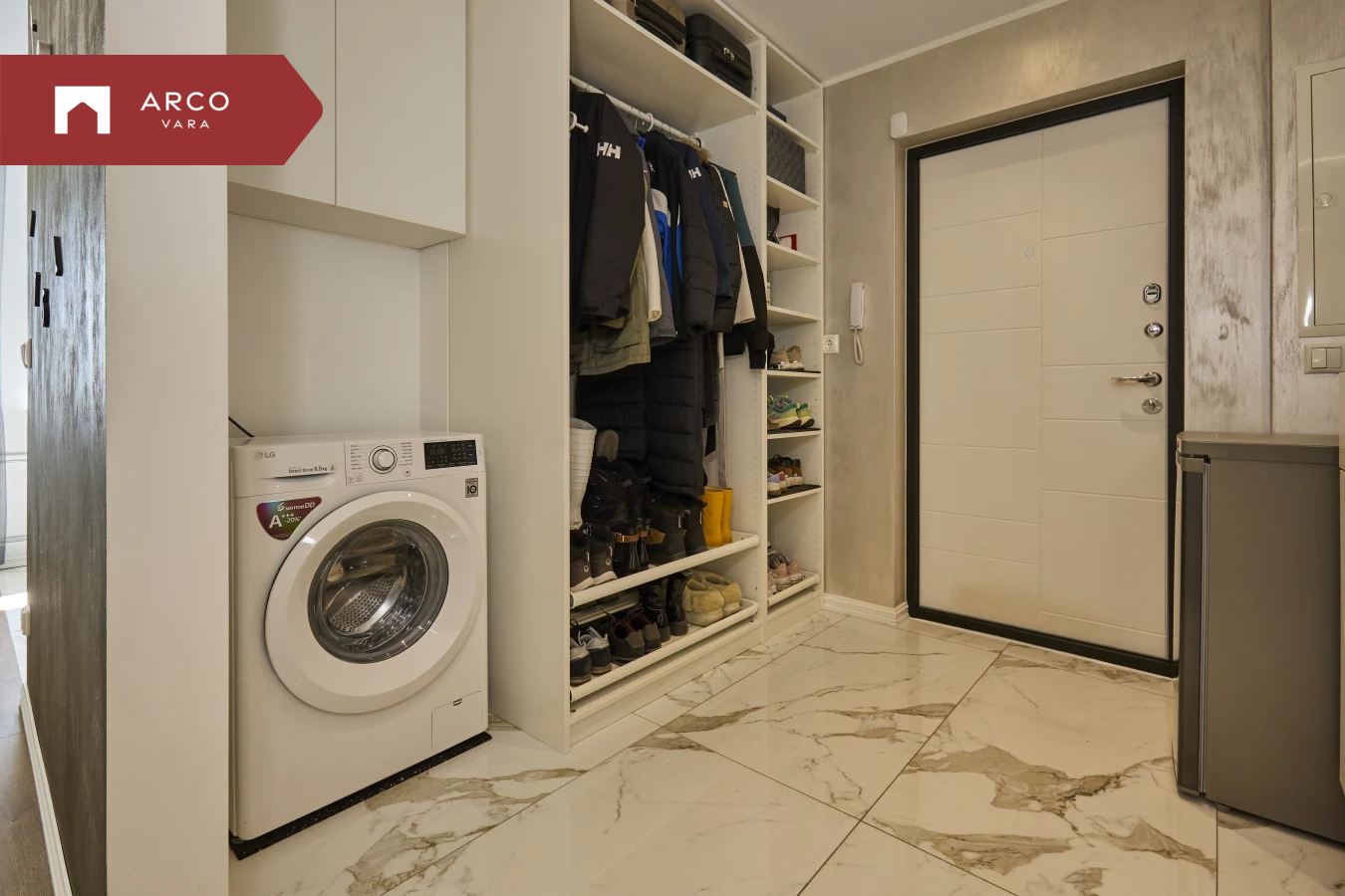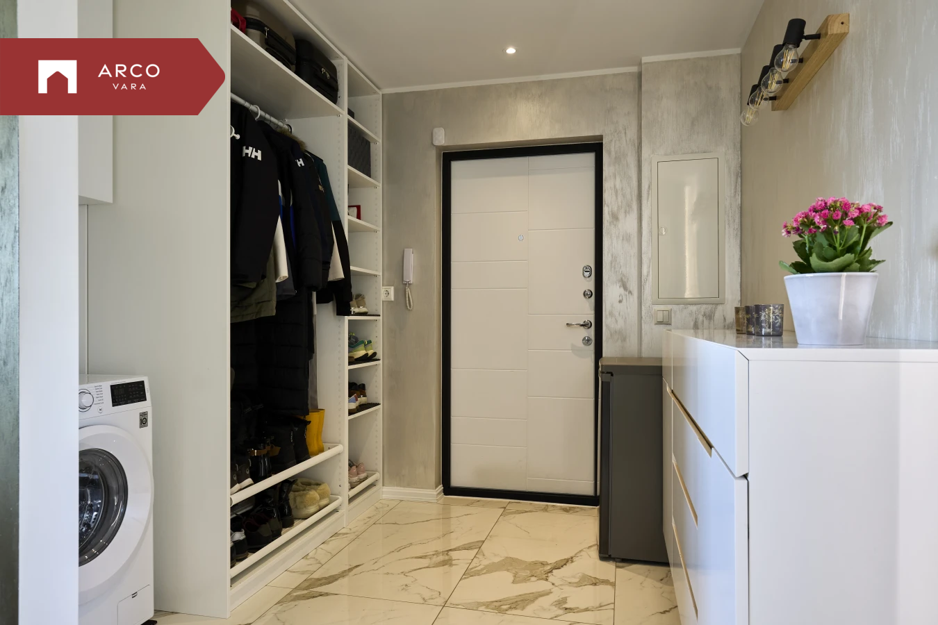 Esik - avatud garderoob, pesumasin, kummut, peegel, põrandaküte, korteri elektrikilp.