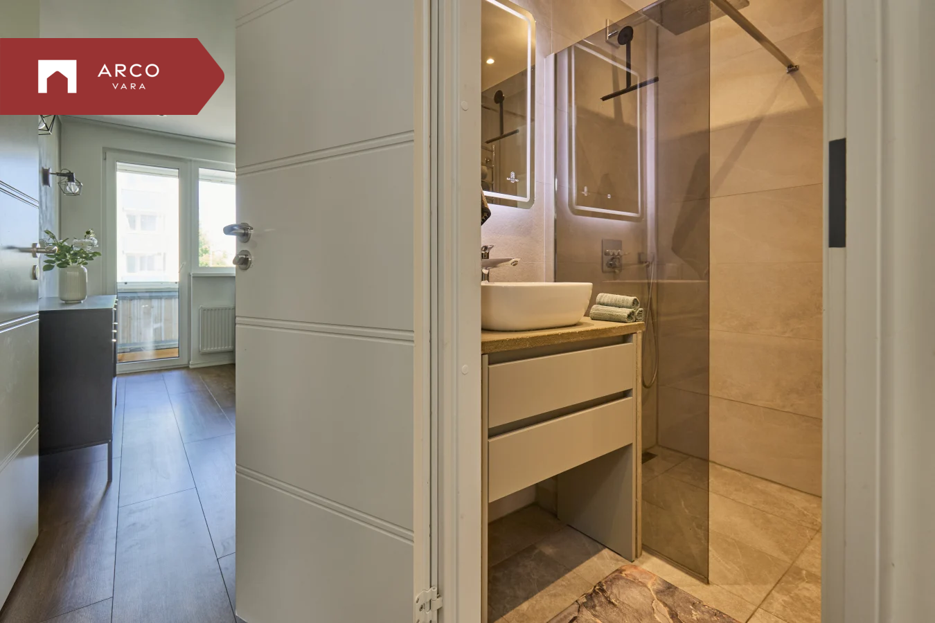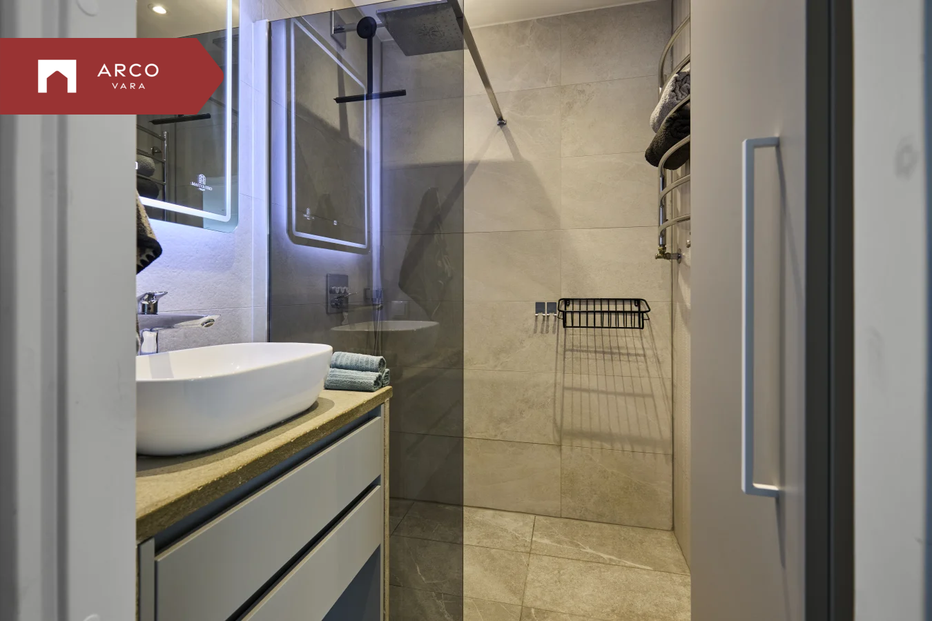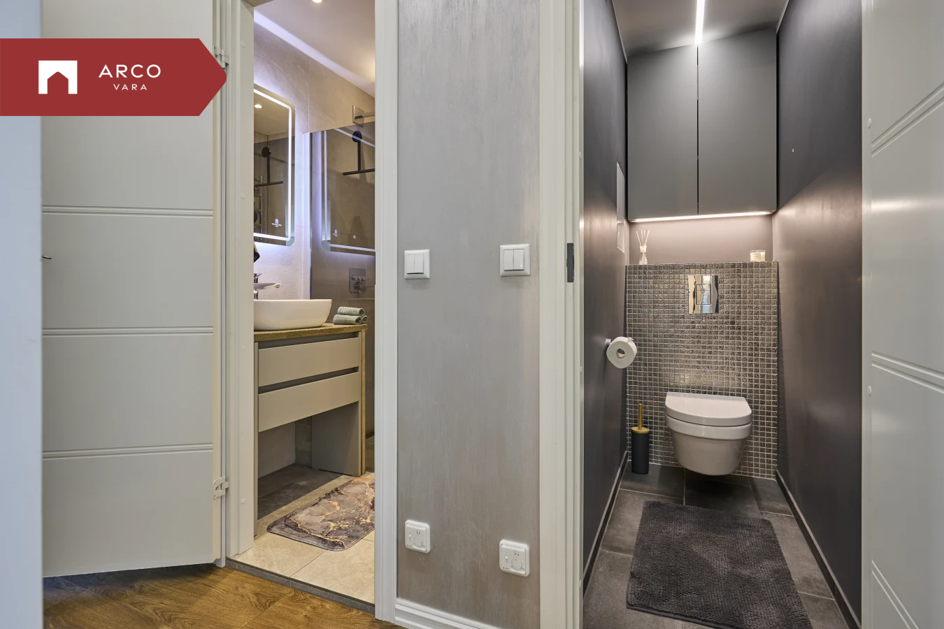 Wc ja dušširuum - eraldatud, möbleeritud, mõlemal põrandaküte ja tsentraalselt köetav redel, duššinurk.