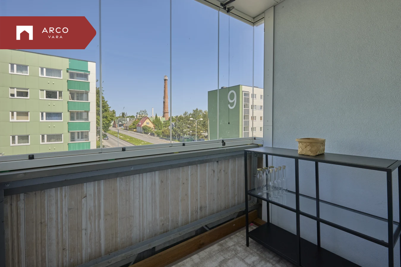 Kontor ja rõdu - kummut, väike diivanvoodi. Rõdul maas terassilaud ja vaip, riiul ja rõdu valgustus. Kaetud liigutatavate klaaspaneelidega.