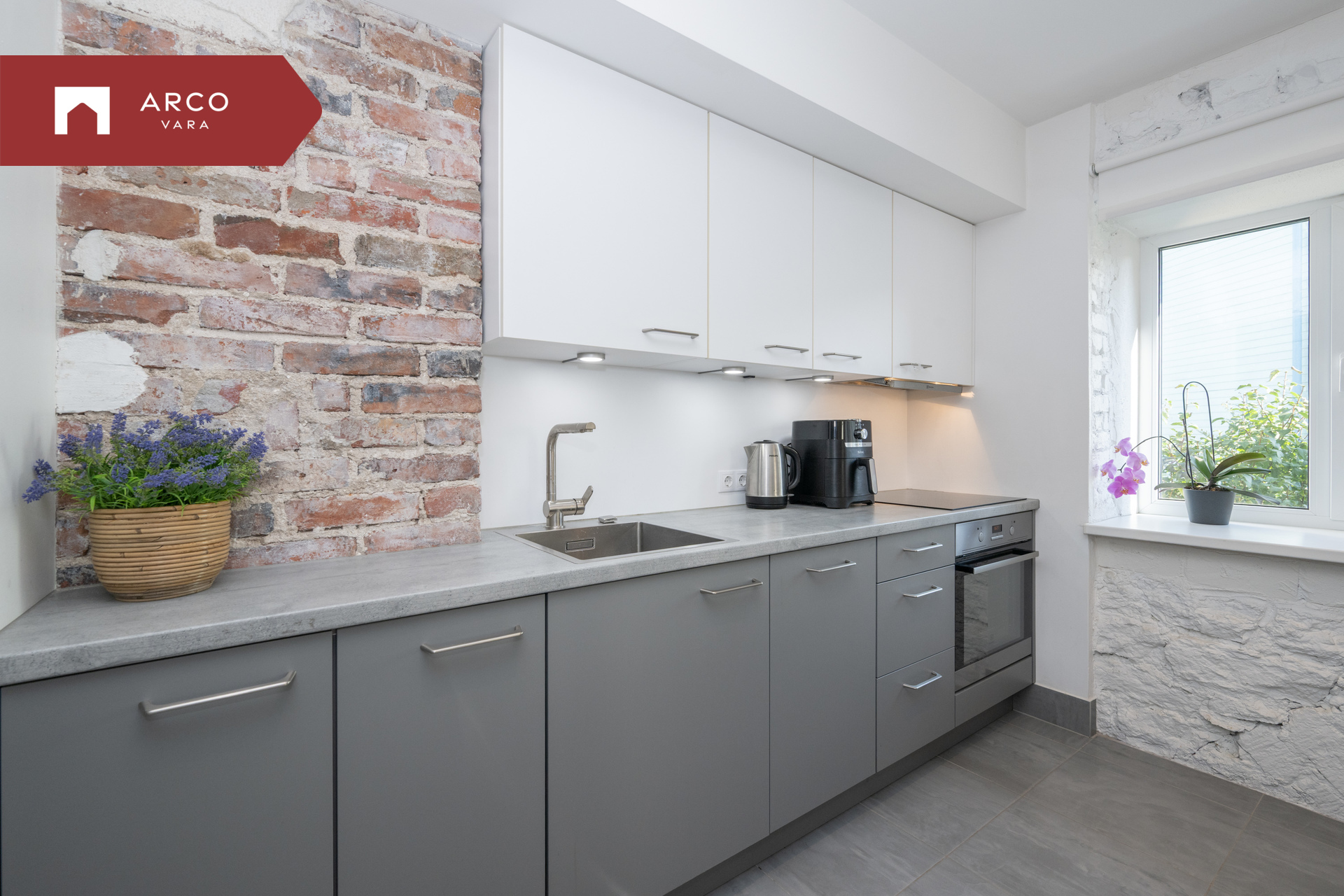 - avatud köök: integreeritud köögimööbel koos tehnikaga (keraamiline induktsioon pliit, ahi, kubu, nõudepesumasin), söögilaud (mille all on madal integreeritud külmik) koos 4 tooliga