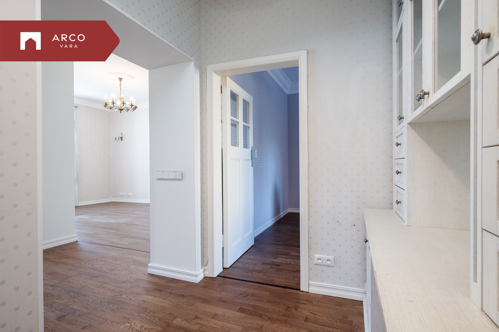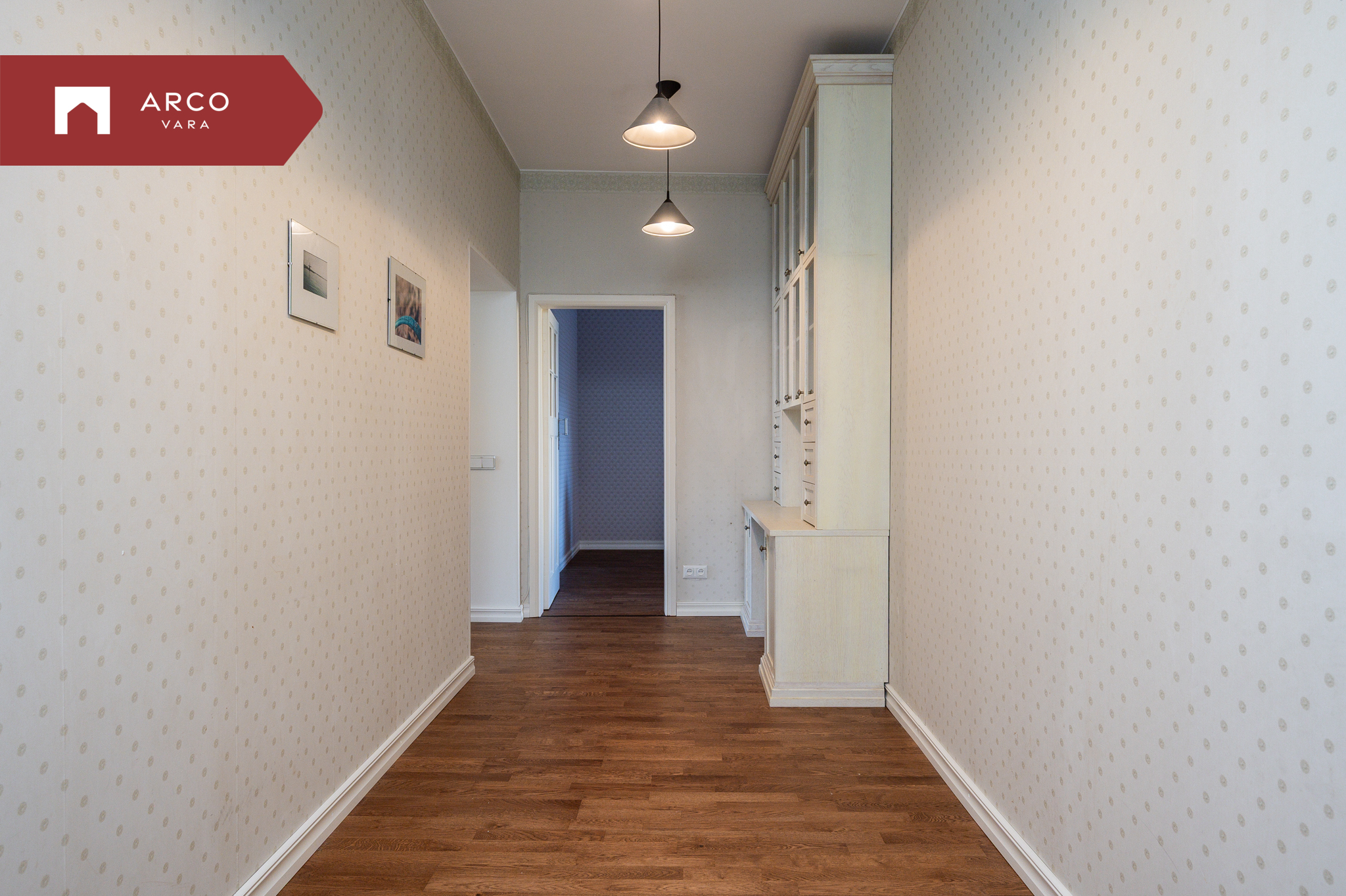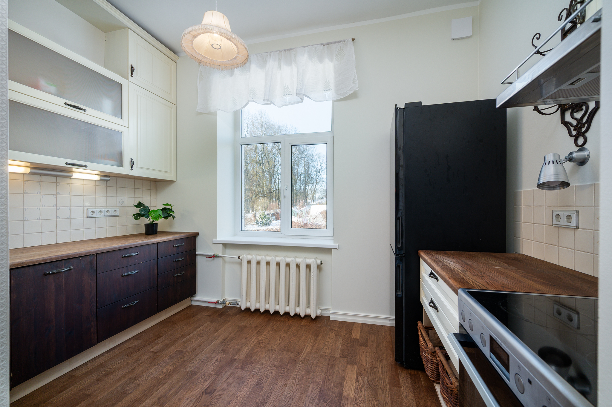 - Kvaliteetsed materjalid: Põrandaid katab naturaalne puitparkett, seinu kaunistavad hoolikalt valitud tapeedid, mis harmoneeruvad hoone stiiliga. Osa köögimööblist vajab värskendust.
