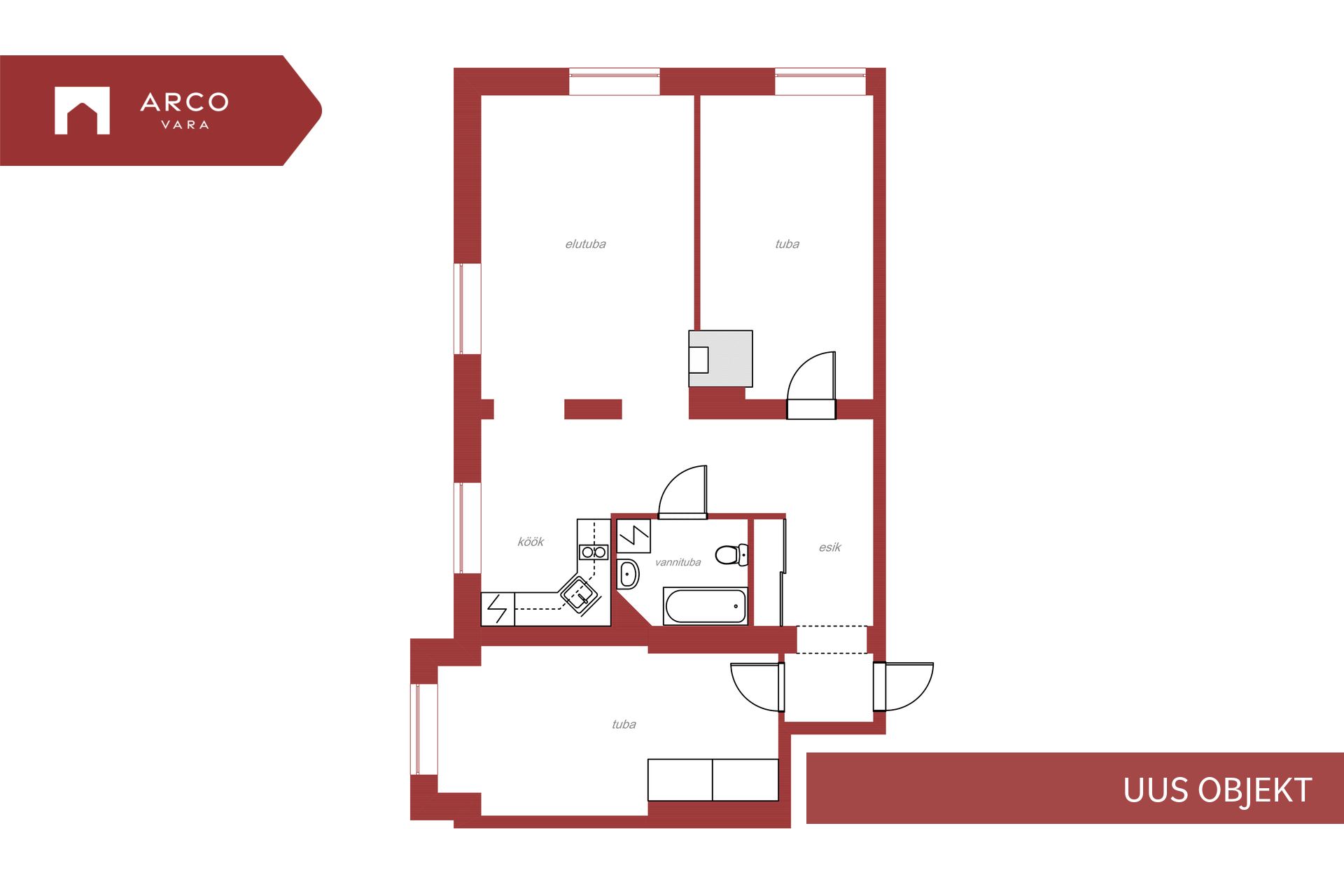 - 3 tuba: elutuba-köök, kaks magamistuba ja tualett-vannituba;