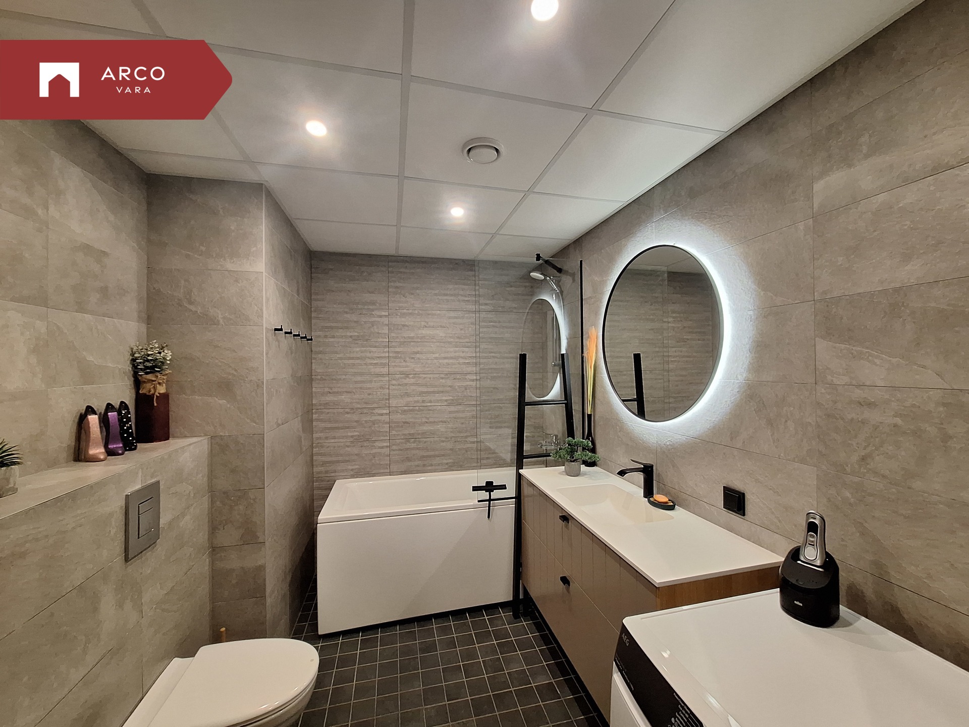 Plaaditud vannituba, reguleeritav põrandaküte, heledates toonides seinad.