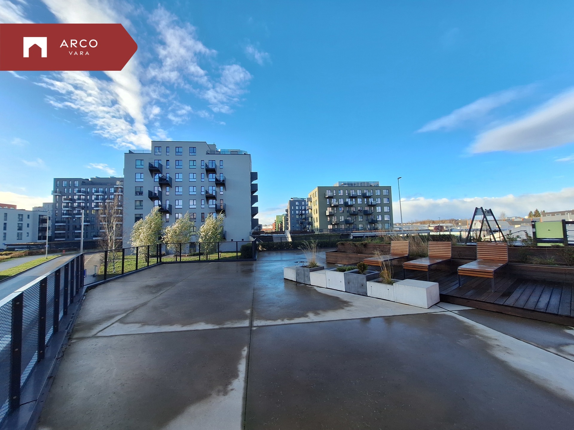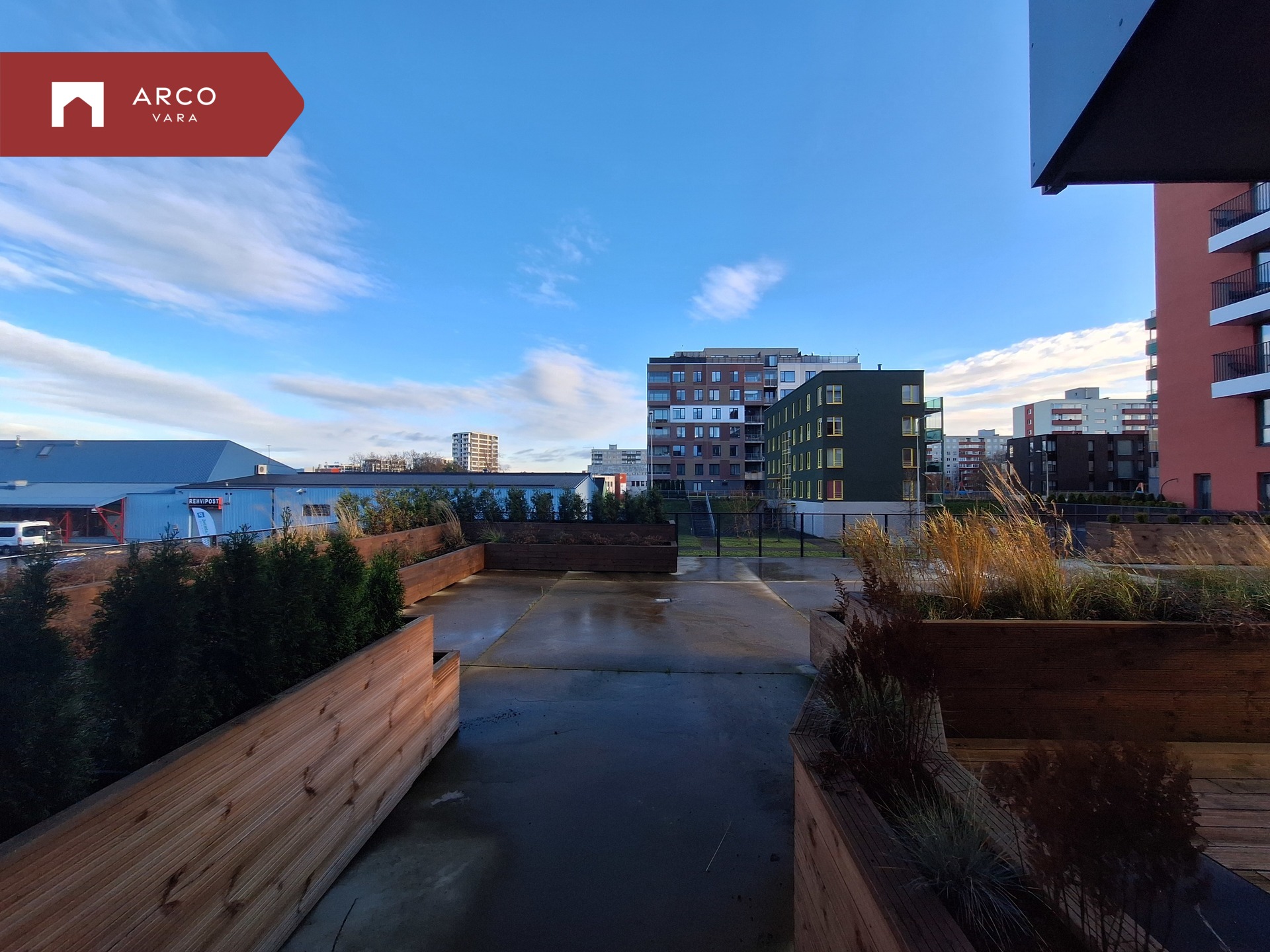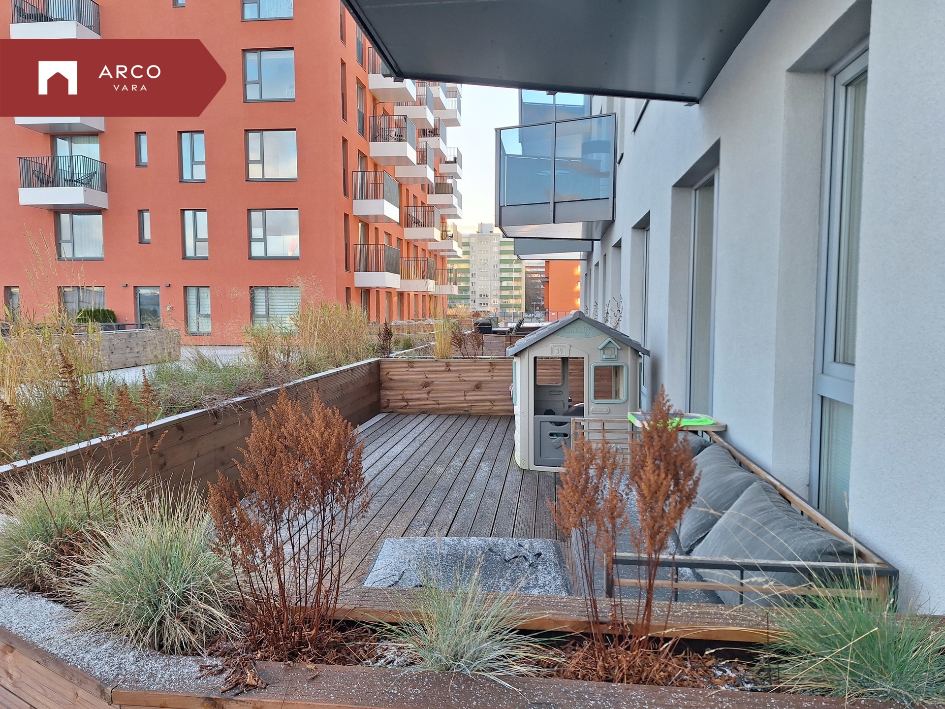 Sooja suvepäeva nautimiseks on korteril 19 m² terrass, kust pääseb mugavalt oma kodu privaatsele õuealale. Kahe maja vahel on eraldi pere puhkeala: laste mänguväljak, grillimisala, lamamistoolid ja lauaga istumisnurk – ideaalne koht nii perega lõõgastumiseks kui ka sõpradega mõnusaks kokkusaamiseks.