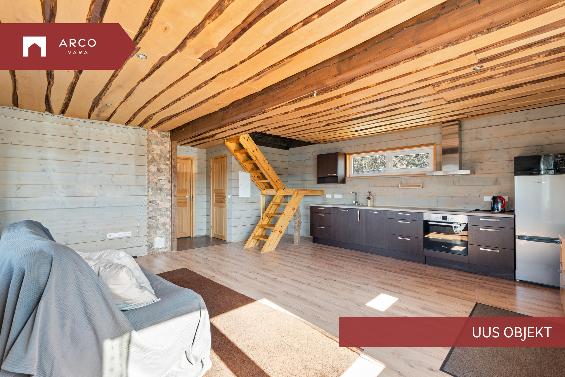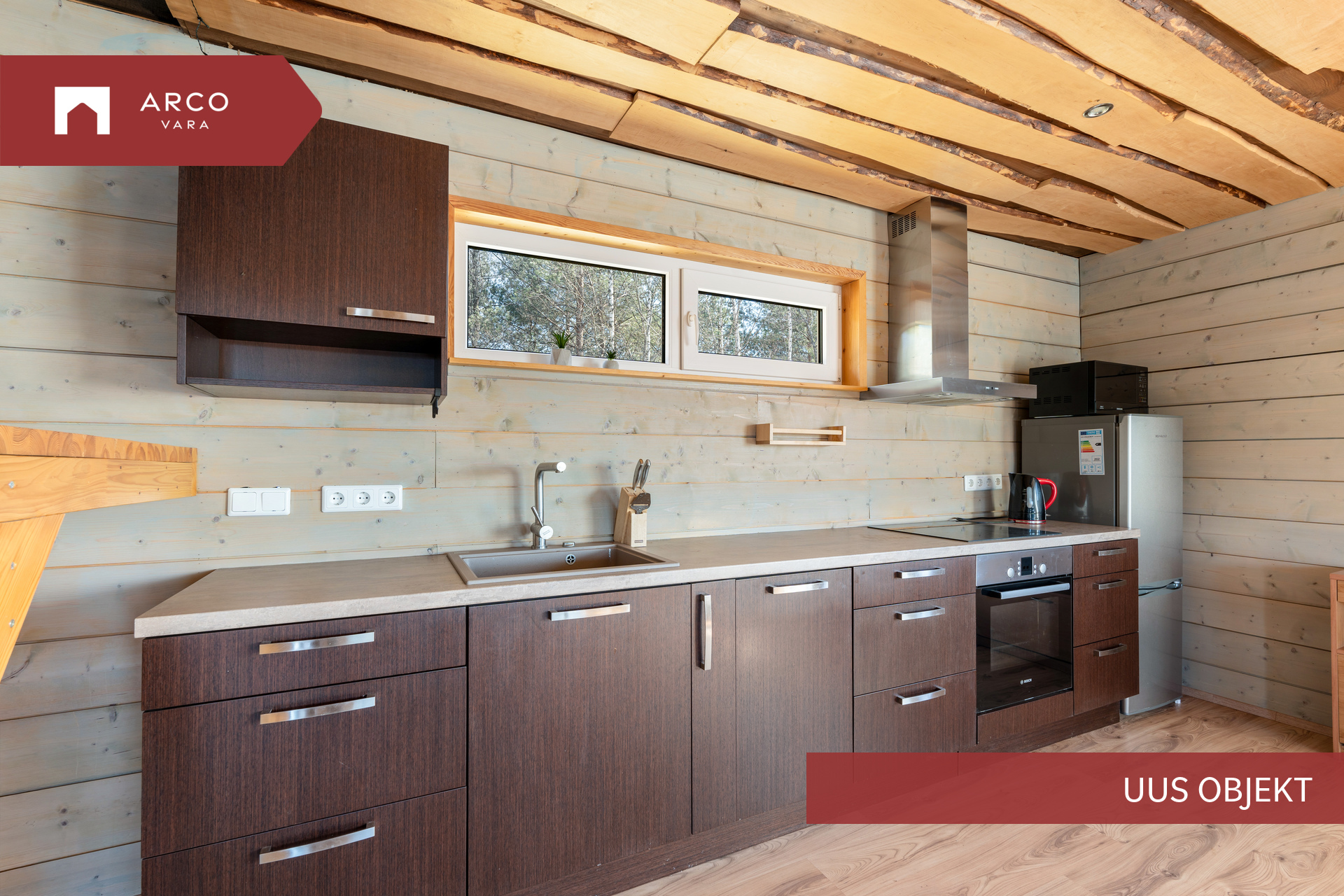Puhkemajas on eritellimusel valminud köök. Kogu piltidel olev mööbel ja tehnika tuleb soovi korral kaasa ning on hinna sees.