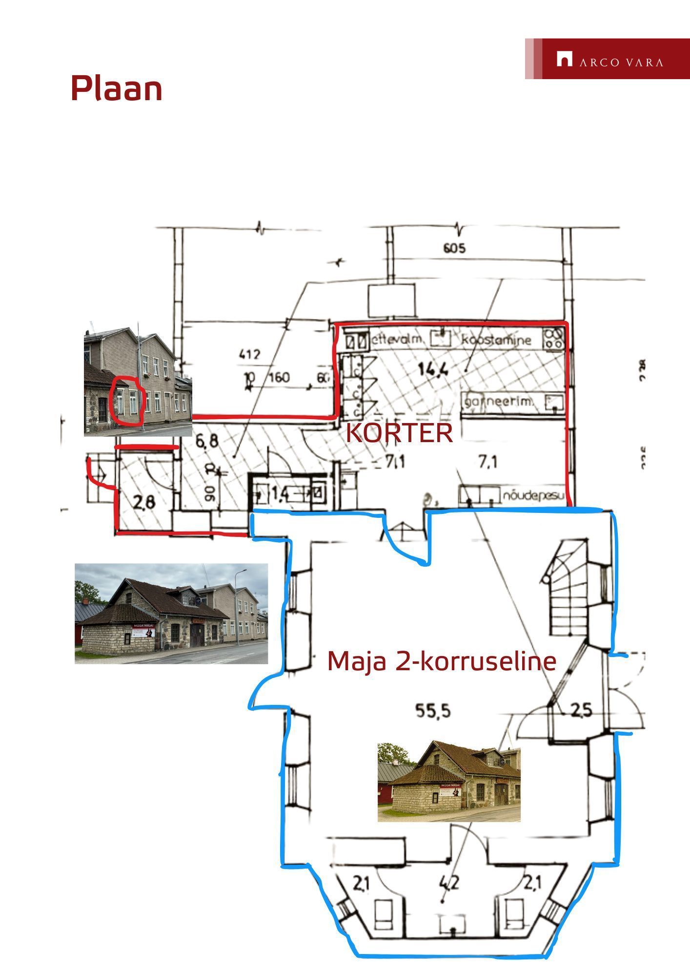 Nii korter (hetkel on seal köögiosa) kui ka majaosa ehk äripind on kõik üks ühendatud osa st äripinnast pääseb kenasti korterisse (köögiosa), seega võimalus ehitada see väikeste ümberehitustega üheks suureks elamuks.