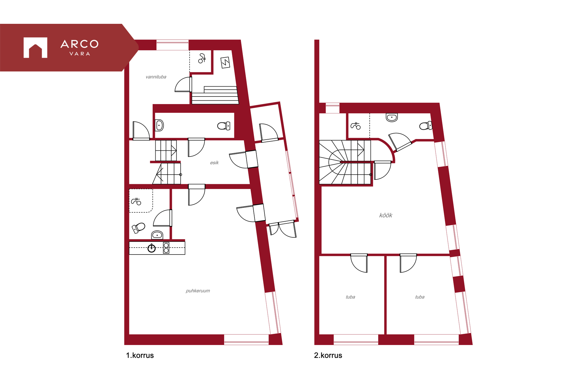 2. korrus: elutuba-köök, kaks magamistuba, duširuum-tualett